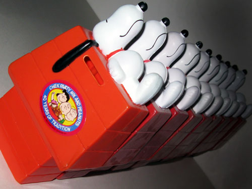Chex also released a variety of Peanuts and Chex mix themed premiums in conjunction with this bank. They include a storage tin, serving bowl, recipe book, canteen and seasoning mix. These items are harder to find since many of them were only available through mail-in offers. Expect to pay under $15 for the kitchenwares, and under $4 for the seasoning mixes. View more Chex promotional materials…