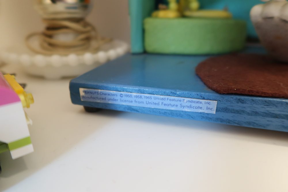 What secrets does it hold? Before buying the Peanuts Pelham Puppets Display, I didn’t know that each Pelham Puppet display is hand-made. Each one is slightly different, yet each follows a basic structure. Snoopy is in the middle, with Charlie Brown and Woodstock on the side standing on a platform. Many have a doghouse type topper, but others just have fringed Peanuts fabric. The sides and back has Peanuts fabric on the outside, with blue fabric inside. The Peanuts fabric was also used for bed sheets from the era. The base uses felt for aesthetics and to keep the sound of clicking feet from being annoying.