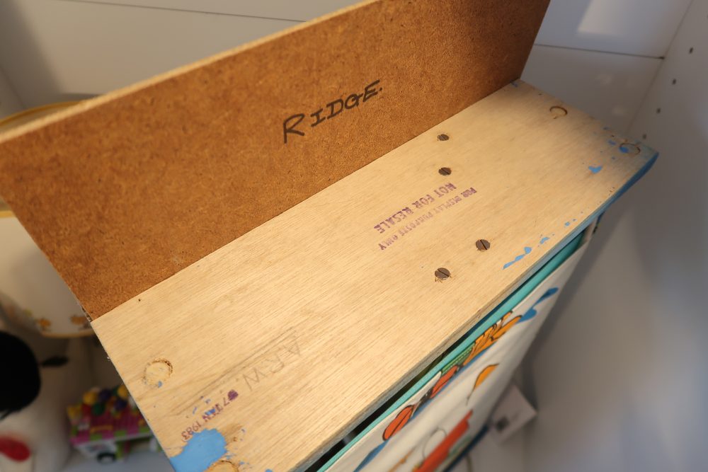 Looking under the doghouse roof, we can see how it was made and who made it. The piece is signed by A.R.W., which I assume is the handy person behind this amazing display. Afterwards, a stamped date of January 7, 1983. Also stamped is a warning “For Display Purposes Only. Not for Resale.” The creator also labeled the ridge for the Doghouse and wrote instructions for its use.