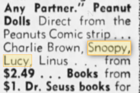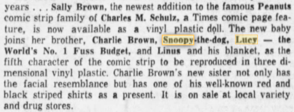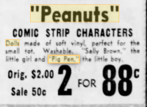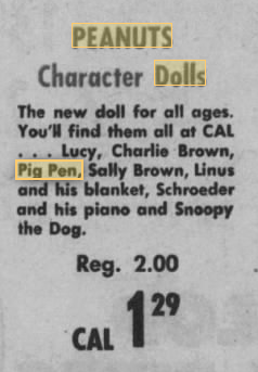 While researching these dolls, I had much annoyance at trying to figure out which dolls came out when. Sally was easy, since she didn’t exist when the first set of dolls was released. Schroeder and Pigpen were sometimes lumped in with the original release. If the original release was for 8″ dolls, where are these smaller versions of Schroeder and Pigpen? Are they so rare that they don’t turn up frequently enough? After scouring the archives available to me and reading collector guides, I am going with Schroeder and Pigpen were not available until 1961. Anyone with any hard evidence to the contrary, please email me at info@collectpeanuts.com.