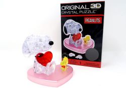 The Snoopy Heart Original 3D Crystal Puzzle is a good starter puzzle a level one difficulty. Snoopy and Woodstock hold crystal hearts while sitting on a heart-shaped platform. Build up Snoopy using the transparent plastic puzzle pieces shaped like traditional puzzle pieces. Each piece is like two stacked puzzle pieces which creates the 3-D puzzle effect. A connecting rod holds the pieces together for easy display. The final details are added with decals on the finished puzzle. I left off the decals because I love to rebuild these these fun, little gems.