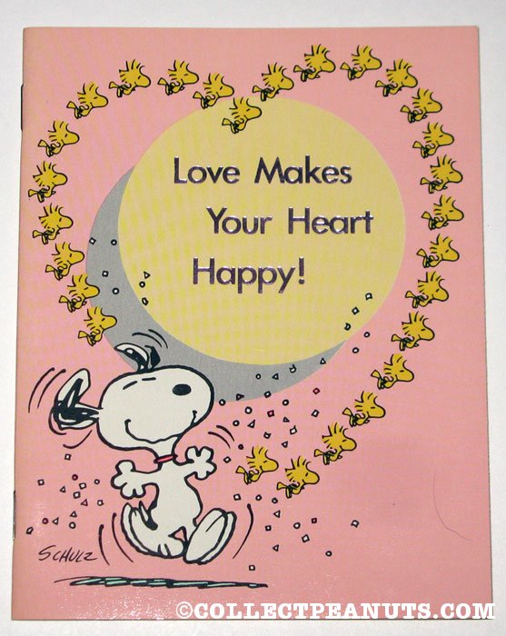Snoopy dancing with Woodstocks in heart formation ‘Love makes your heart happy’ Greeting Card Book
