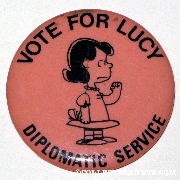 Lucy making fist ‘Vote for Lucy Diplomatic Service’ Button