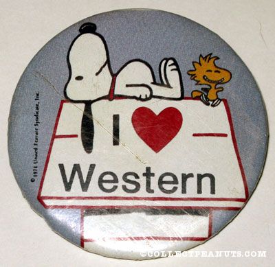 Snoopy on doghouse with Woodstock dancing ‘I Heart Western’ Button