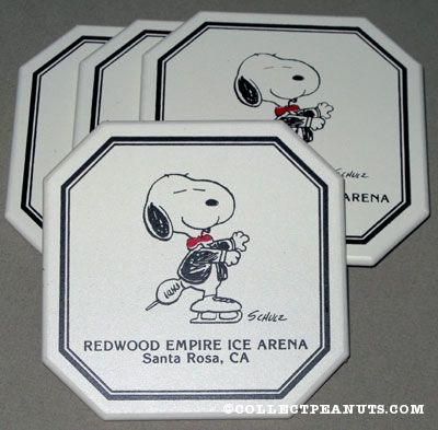 Snoopy in sports coat skating ‘Redwood Empire Ice Arena, Santa Rosa, CA’ set of 4 Coasters