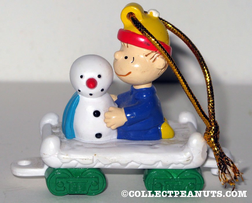 Linus building Snowman train car Ornament
