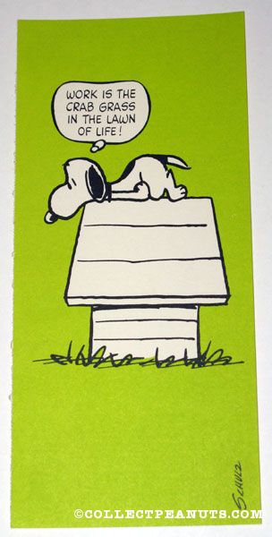 Snoopy on doghouse ‘Work is the crab grass in the lawn of life’ Postcard