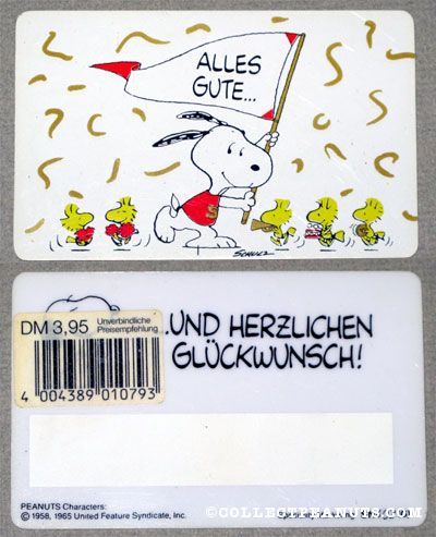 Snoopy waving banner with cheerleader and band Woodstocks ‘Alles gute… und herzlichen gluckwunsch!’ German Wallet Greeting Card