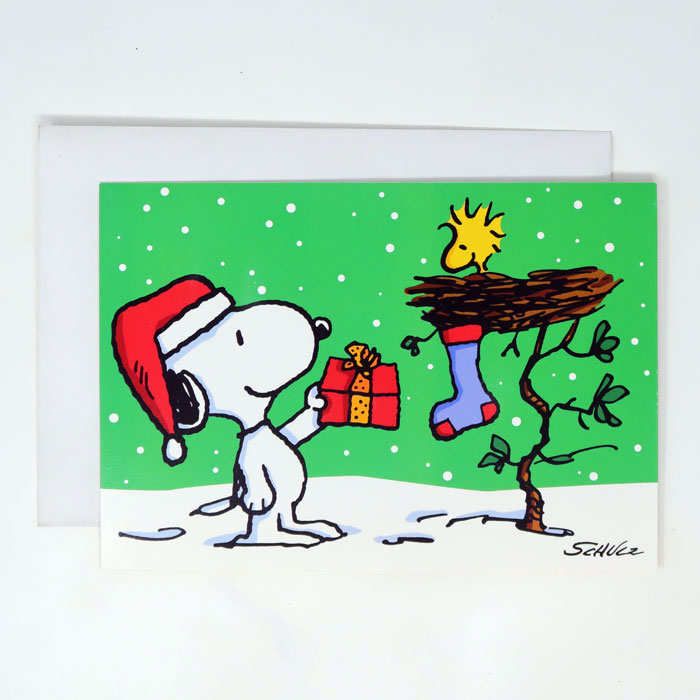Snoopy Giving Present to Woodstock Christmas Card