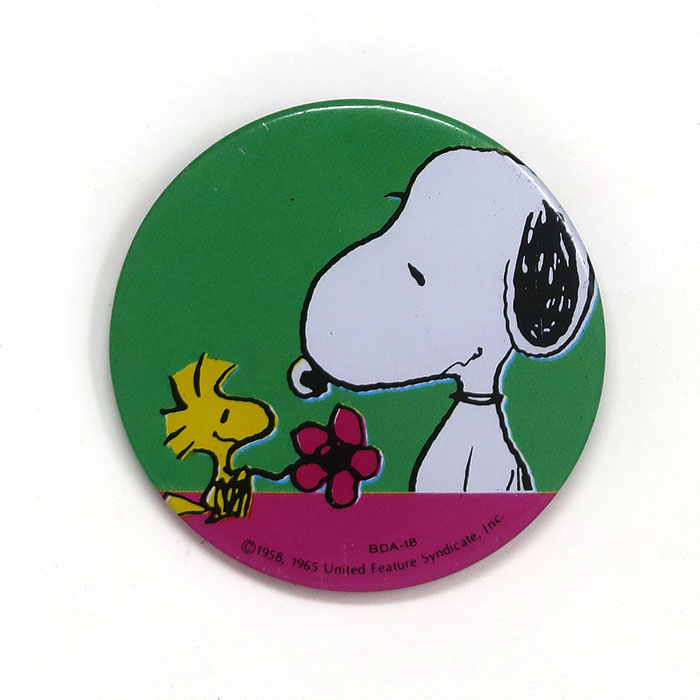 Woodstock giving Snoopy a flower Button