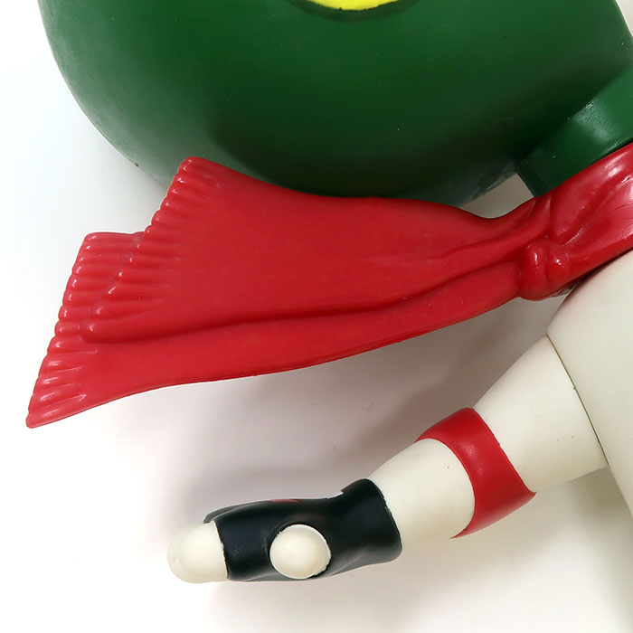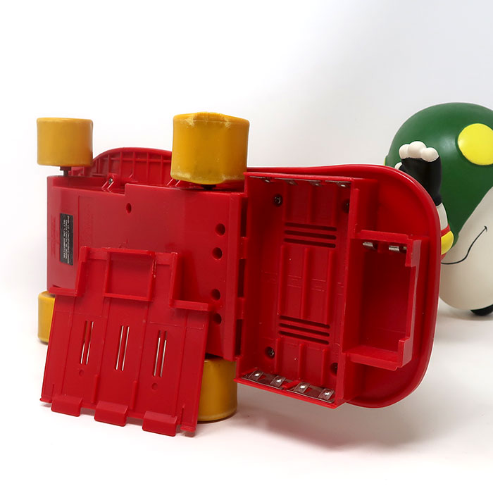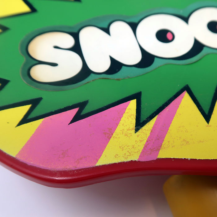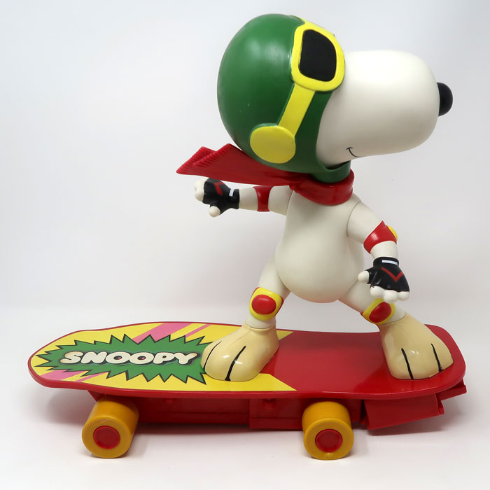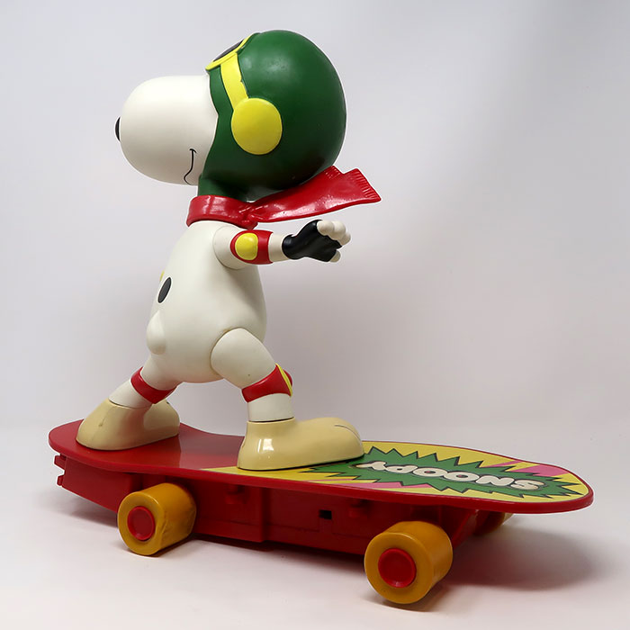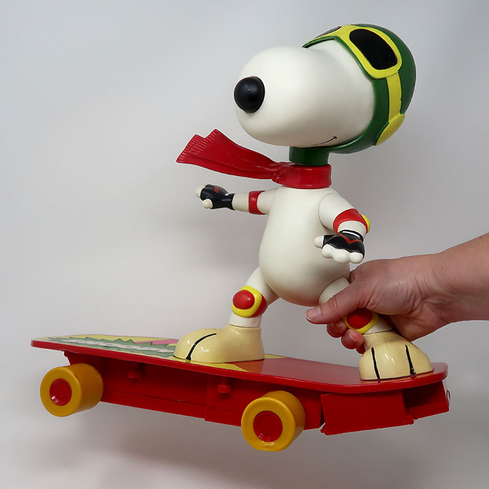 Condition: Shows signs of use overall. Baseplate has typical scratches from use. Back wheels have flat spots that partially interfere with use, but generally only when starting from a standstill. Scarf has some minor spotting, possibly from age. Snoopy sticker has some discoloration on edges. Some “overspray” on front of skateboard top. Typical yellowed feet on Snoopy. Remote is missing the battery cover, but it’s easy enough to keep the battery in with your hand or use tape.