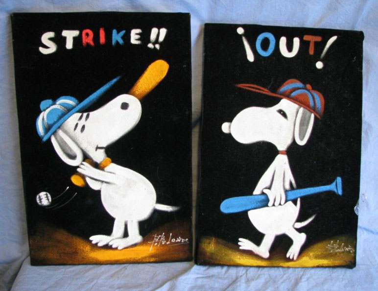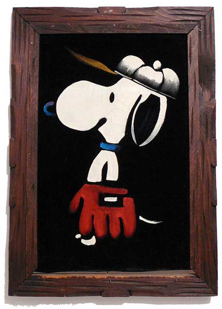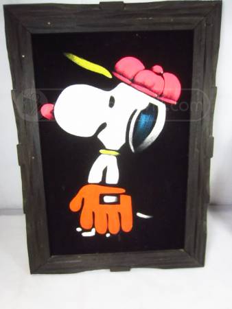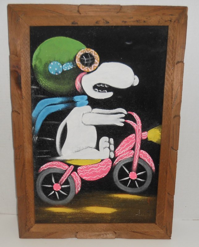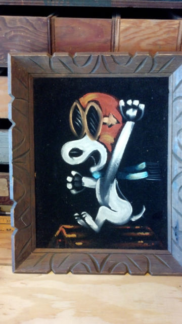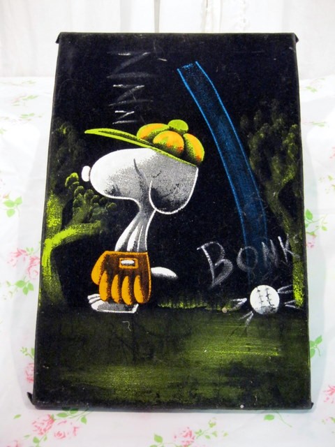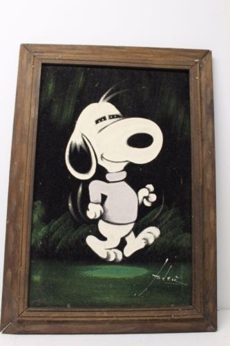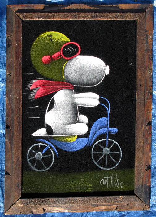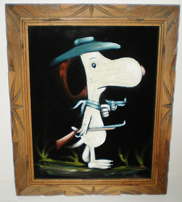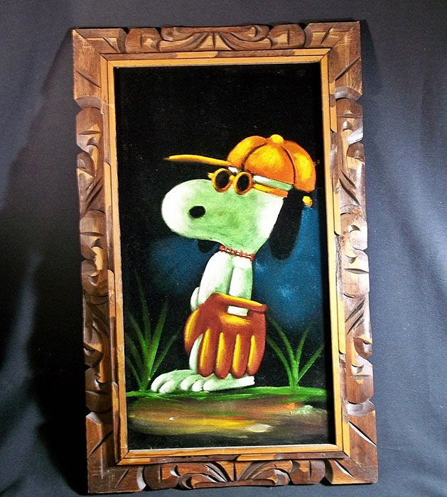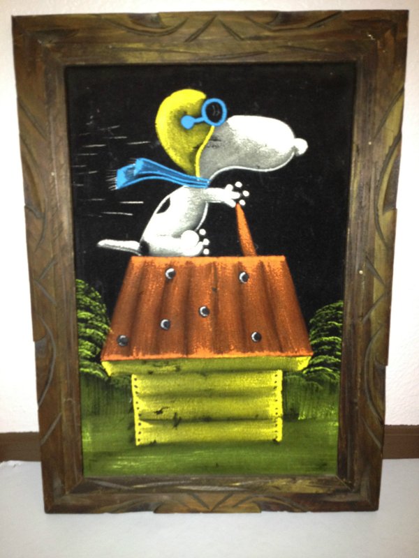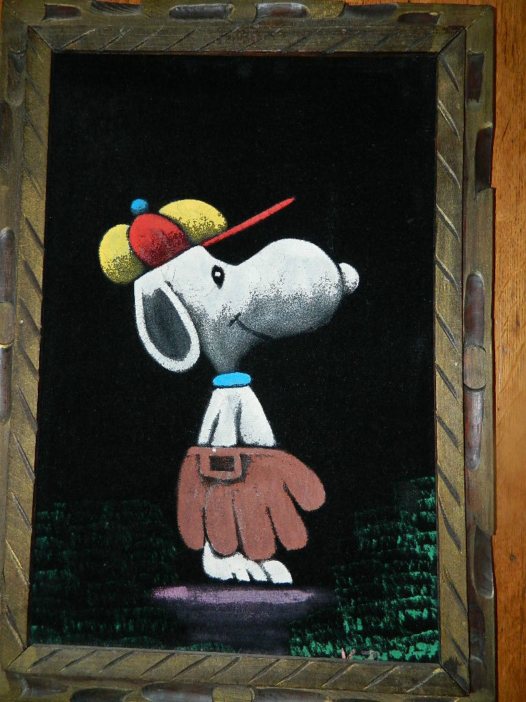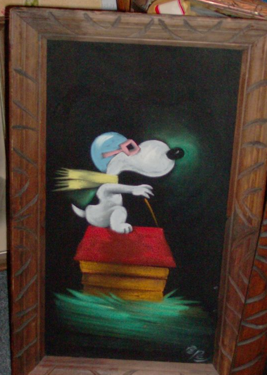 When roaming the aisle through antique stores or clicking through pages on eBay, the strange and unusual always make you pause for a moment. From time to time, you’ll contemplate how this item came into being. In Peanuts collecting, the oddity would be the Peanuts Black Velvet picture. Unlicensed and many made for tourists in Mexico, the Black Velvet artists were prolific back in the day. Their favorite Peanuts character is, of course, Snoopy. Between bull fighting, getting tipsy and riding motorcycles, the Black Velvet Snoopy’s strange pursuits are captured in bright, glowing paint.