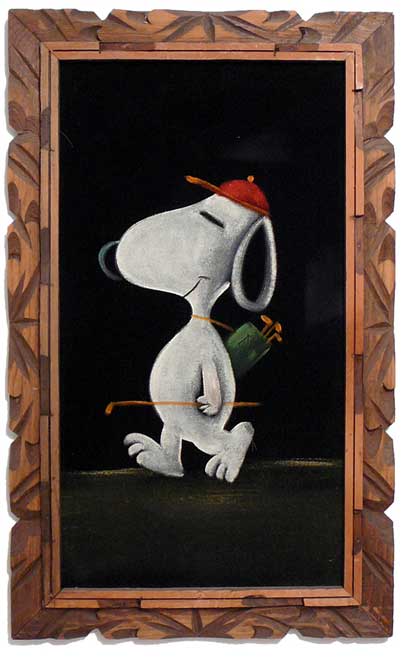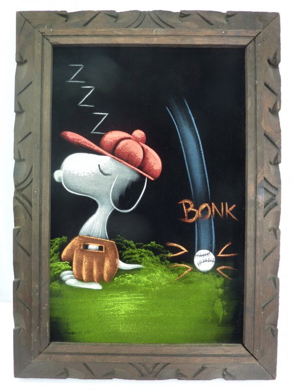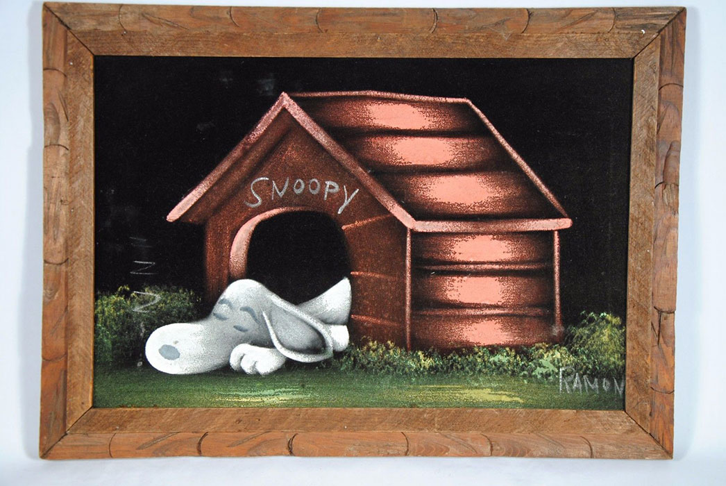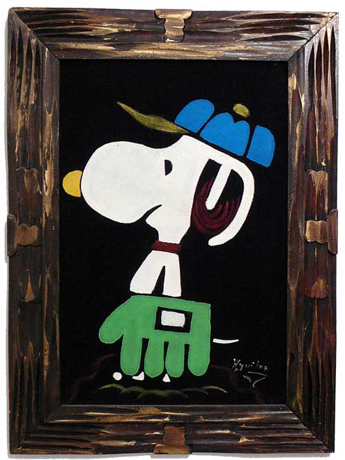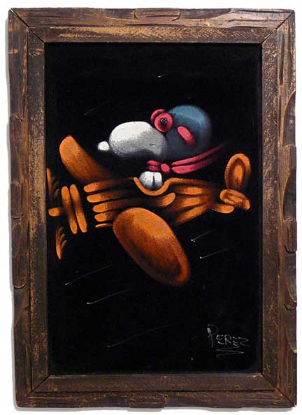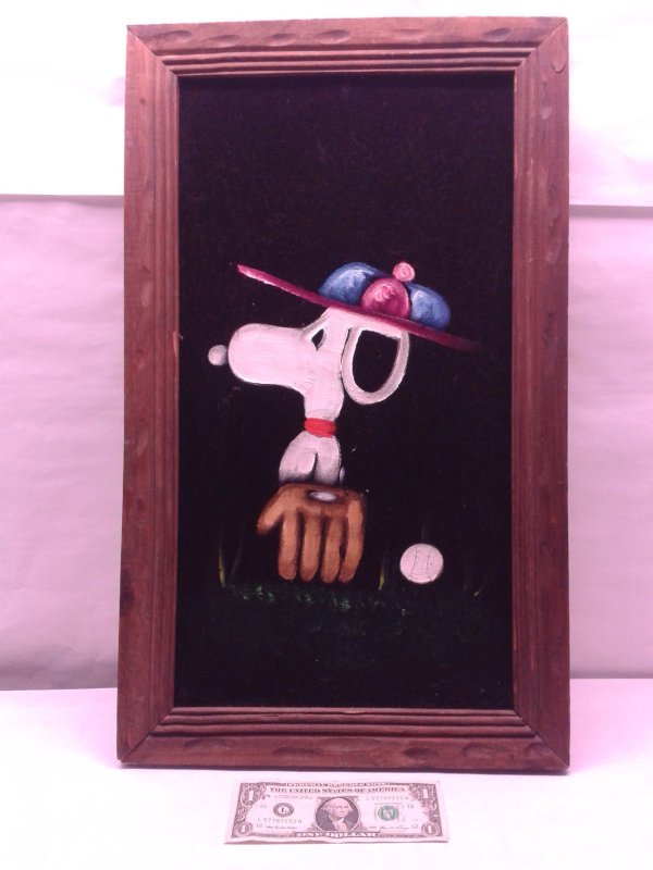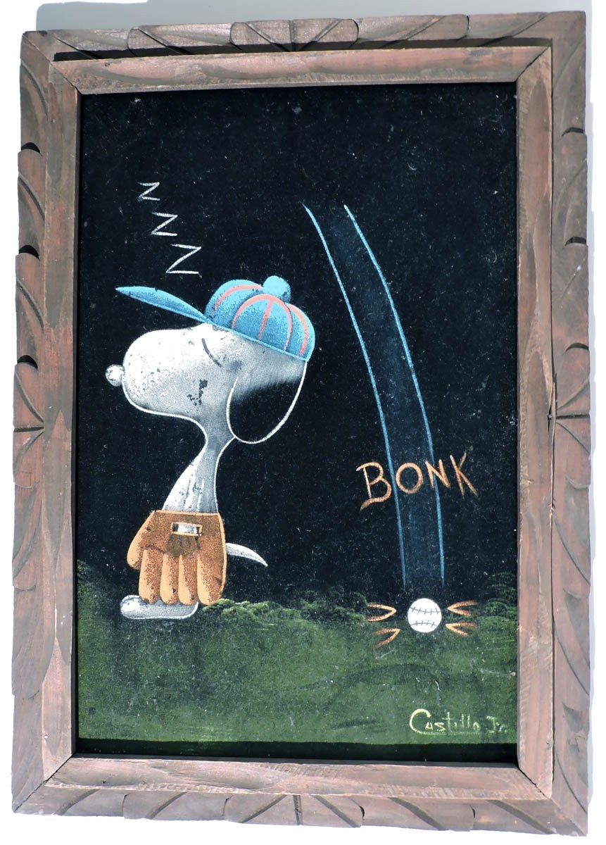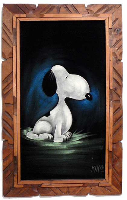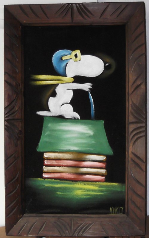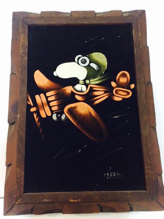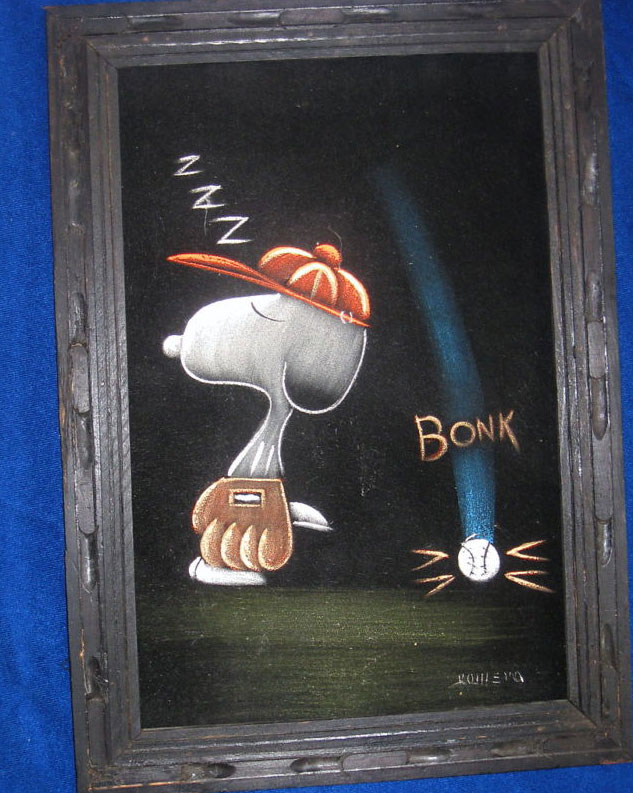 When roaming the aisle through antique stores or clicking through pages on eBay, the strange and unusual always make you pause for a moment. From time to time, you’ll contemplate how this item came into being. In Peanuts collecting, the oddity would be the Peanuts Black Velvet picture. Unlicensed and many made for tourists in Mexico, the Black Velvet artists were prolific back in the day. Their favorite Peanuts character is, of course, Snoopy. Between bull fighting, getting tipsy and riding motorcycles, the Black Velvet Snoopy’s strange pursuits are captured in bright, glowing paint.