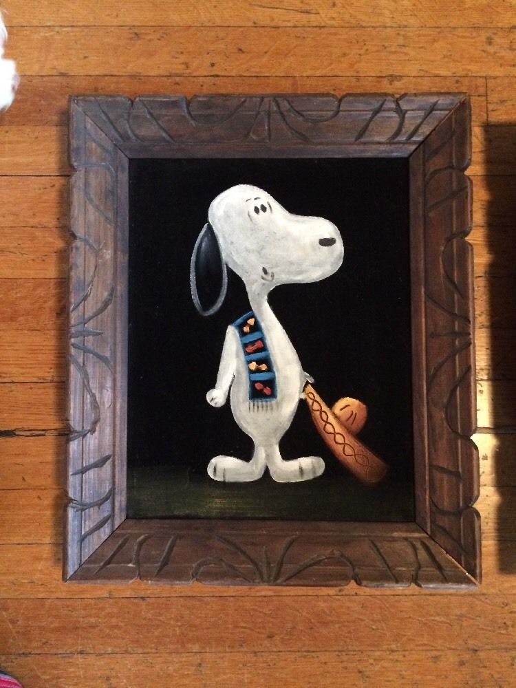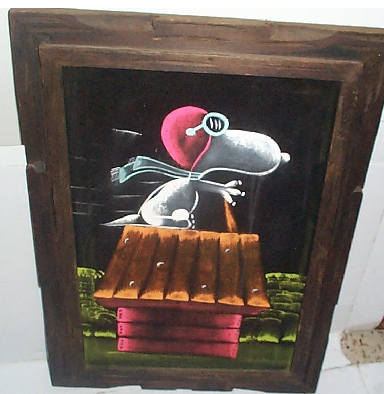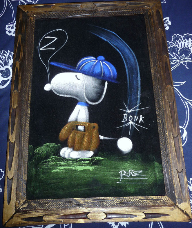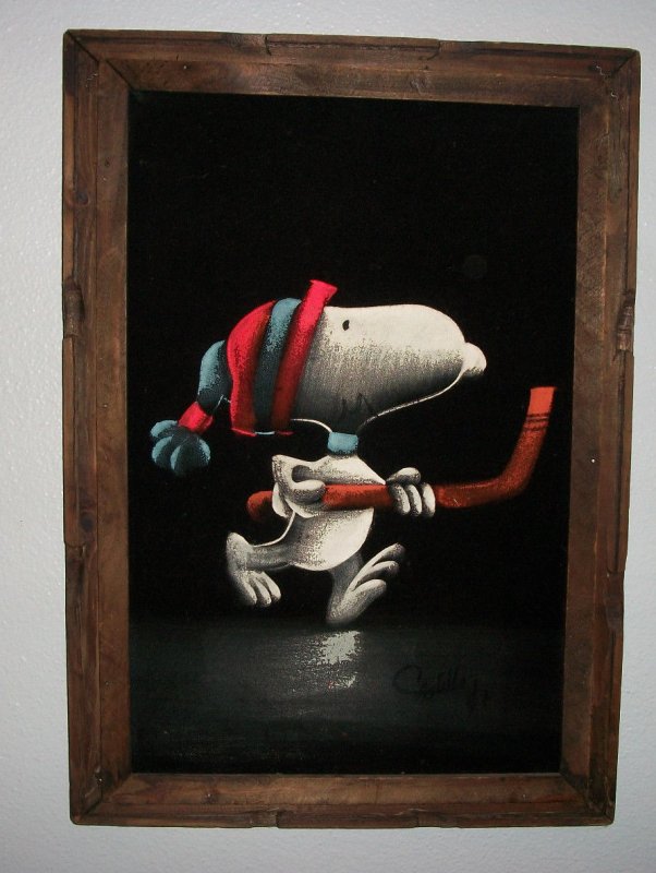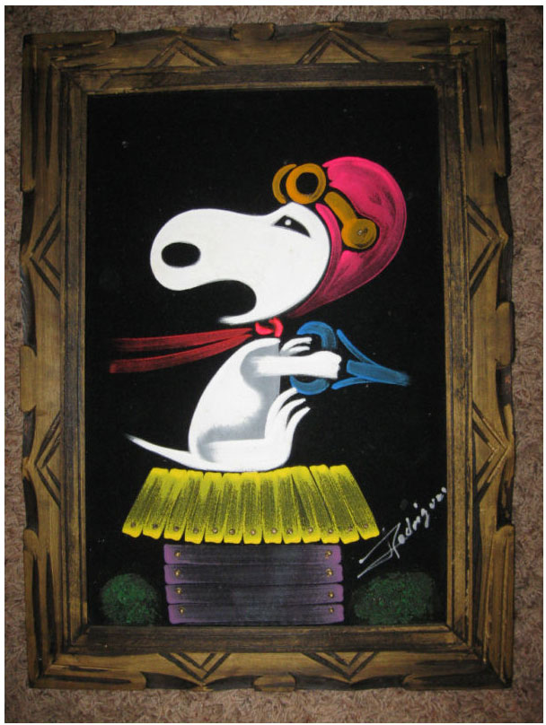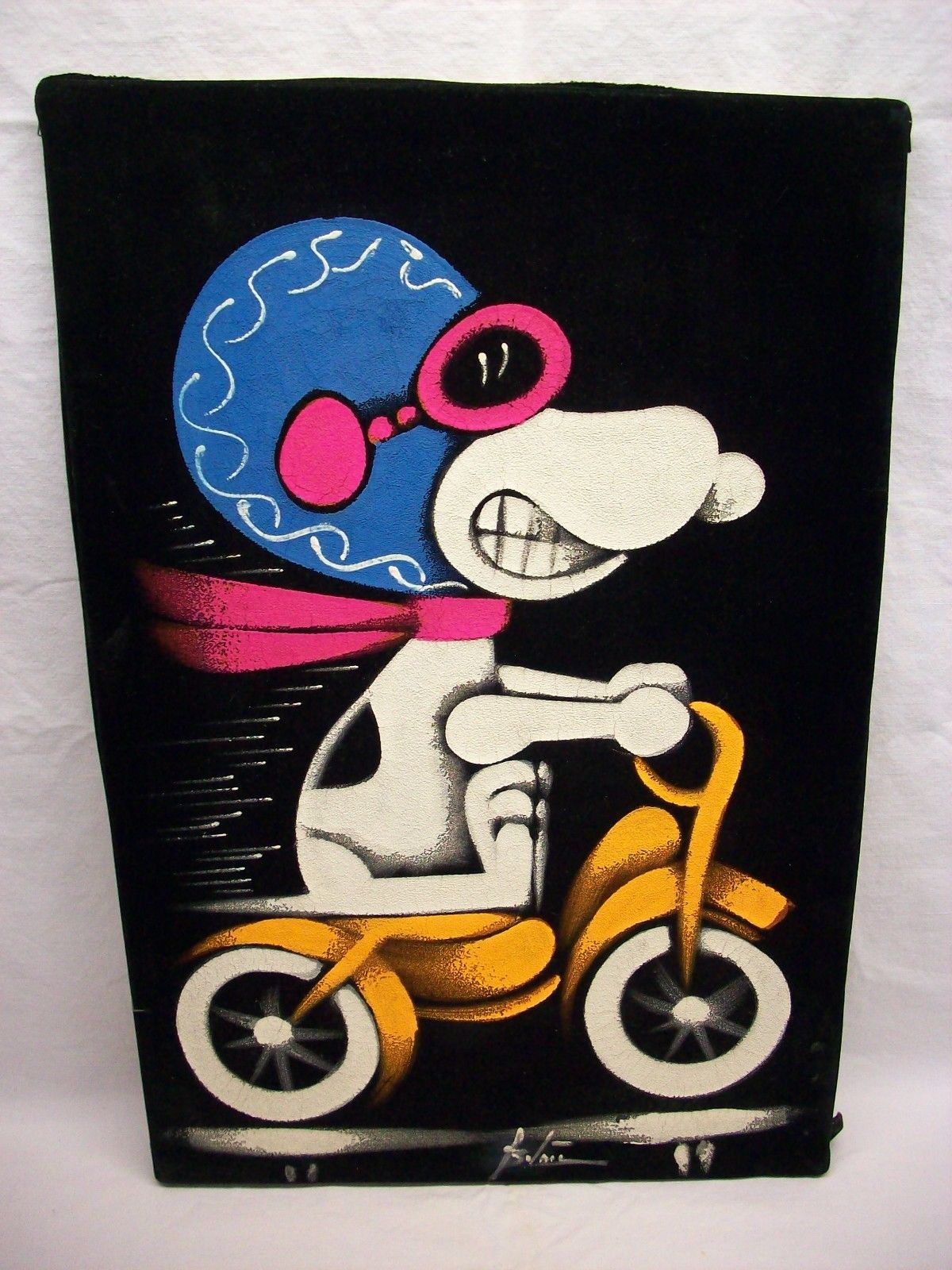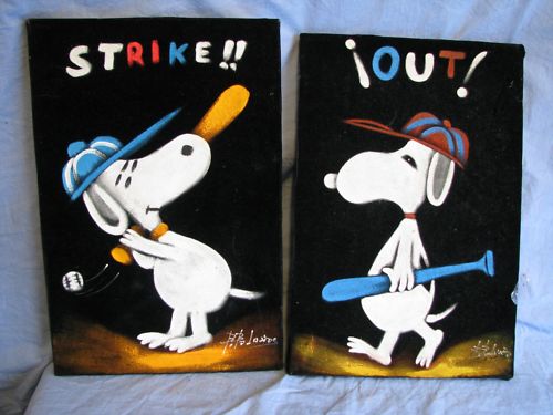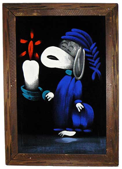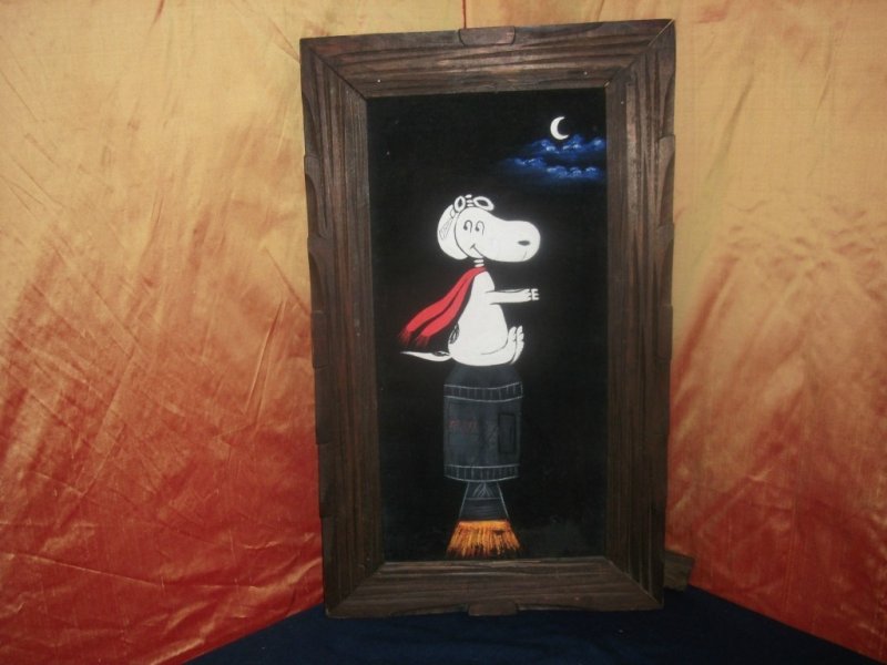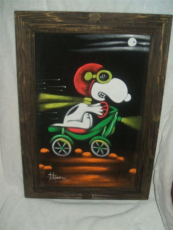 When roaming the aisle through antique stores or clicking through pages on eBay, the strange and unusual always make you pause for a moment. From time to time, you’ll contemplate how this item came into being. In Peanuts collecting, the oddity would be the Peanuts Black Velvet picture. Unlicensed and many made for tourists in Mexico, the Black Velvet artists were prolific back in the day. Their favorite Peanuts character is, of course, Snoopy. Between bull fighting, getting tipsy and riding motorcycles, the Black Velvet Snoopy’s strange pursuits are captured in bright, glowing paint.