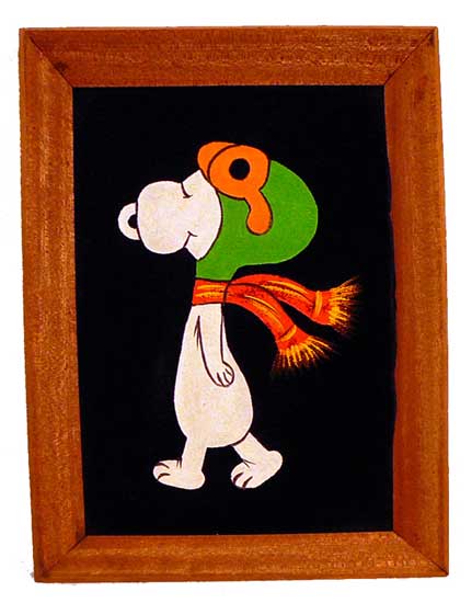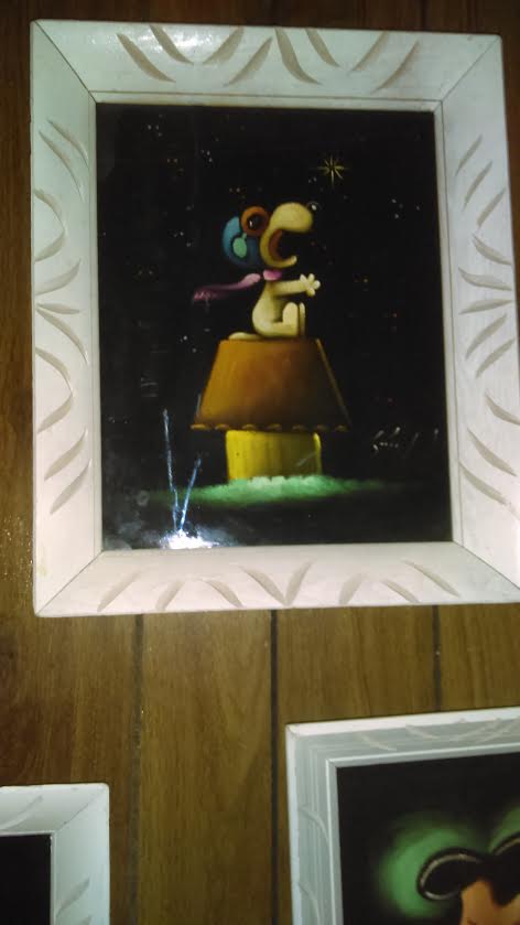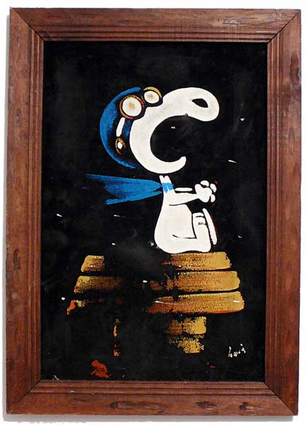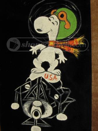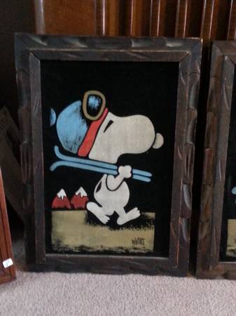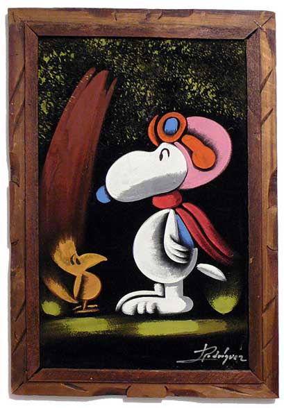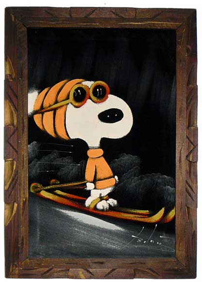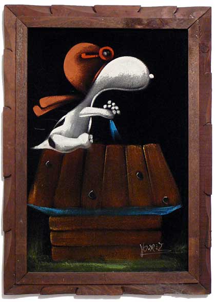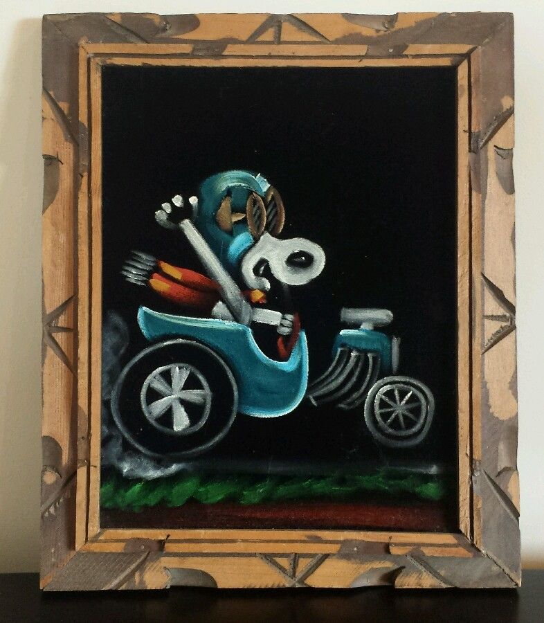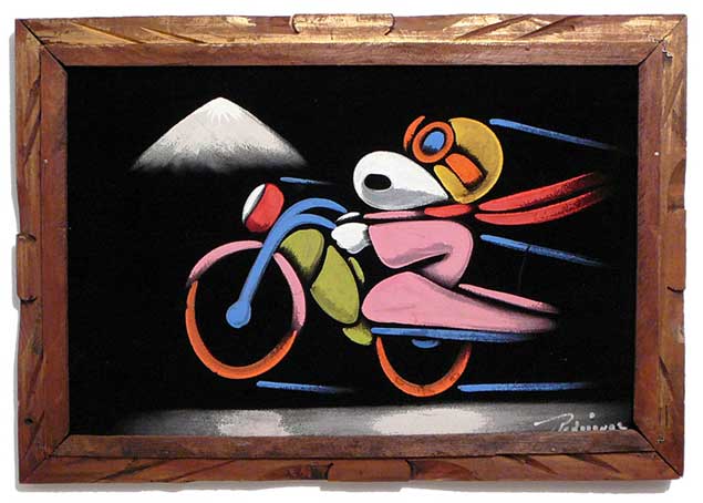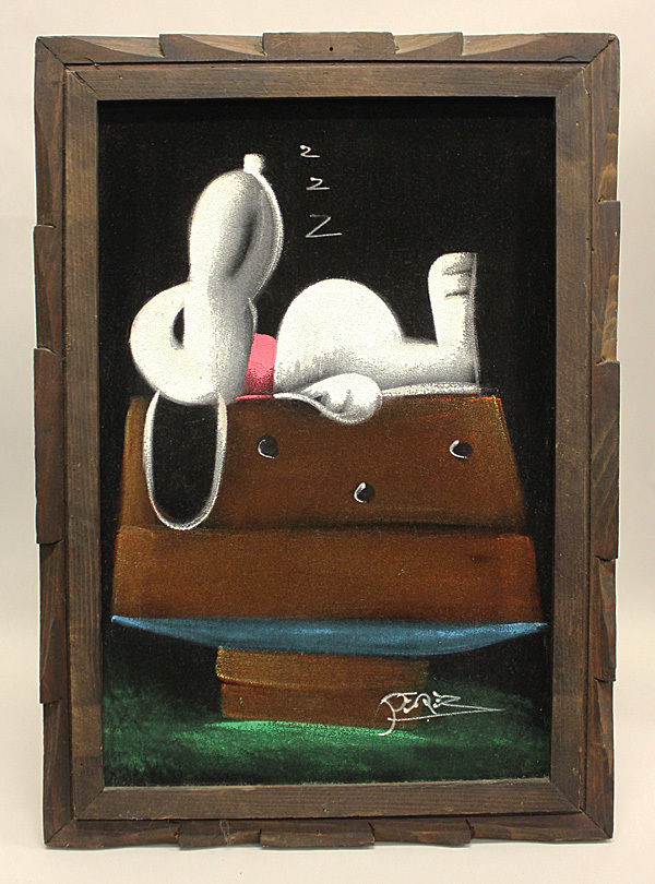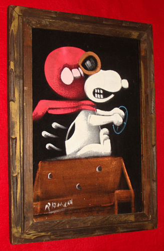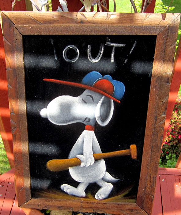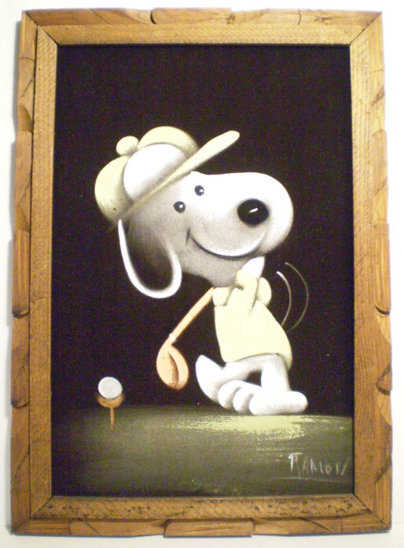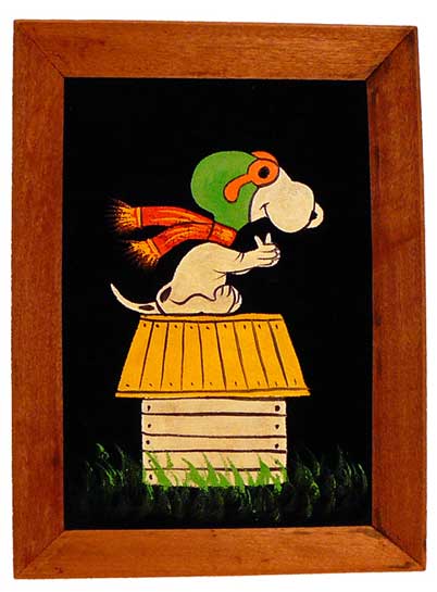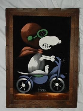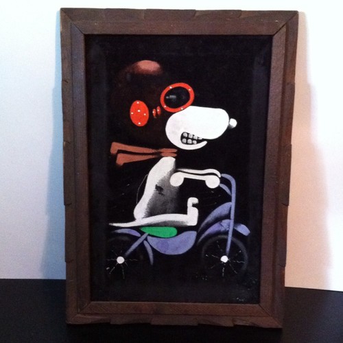 When roaming the aisle through antique stores or clicking through pages on eBay, the strange and unusual always make you pause for a moment. From time to time, you’ll contemplate how this item came into being. In Peanuts collecting, the oddity would be the Peanuts Black Velvet picture. Unlicensed and many made for tourists in Mexico, the Black Velvet artists were prolific back in the day. Their favorite Peanuts character is, of course, Snoopy. Between bull fighting, getting tipsy and riding motorcycles, the Black Velvet Snoopy’s strange pursuits are captured in bright, glowing paint.