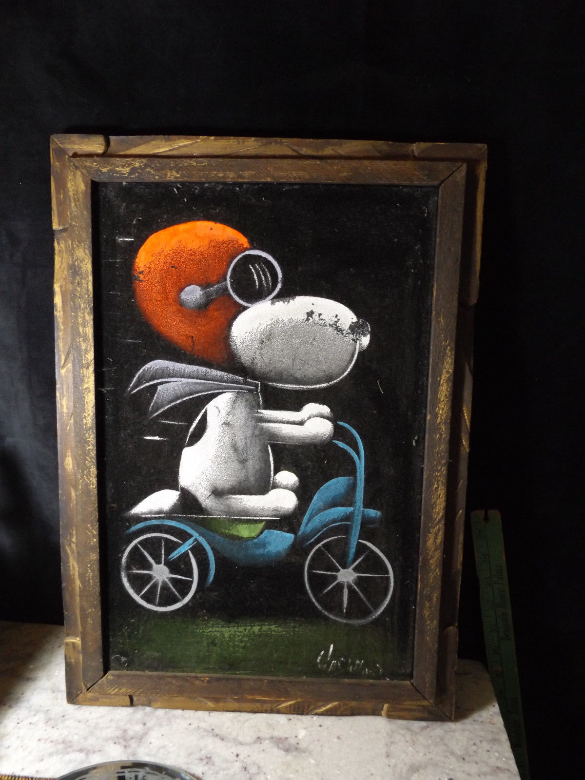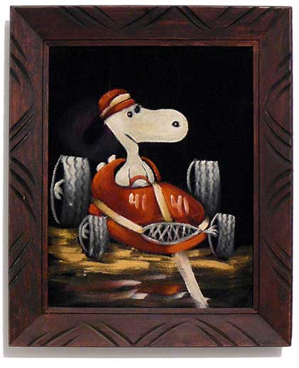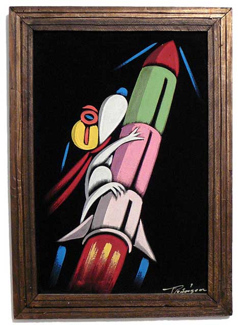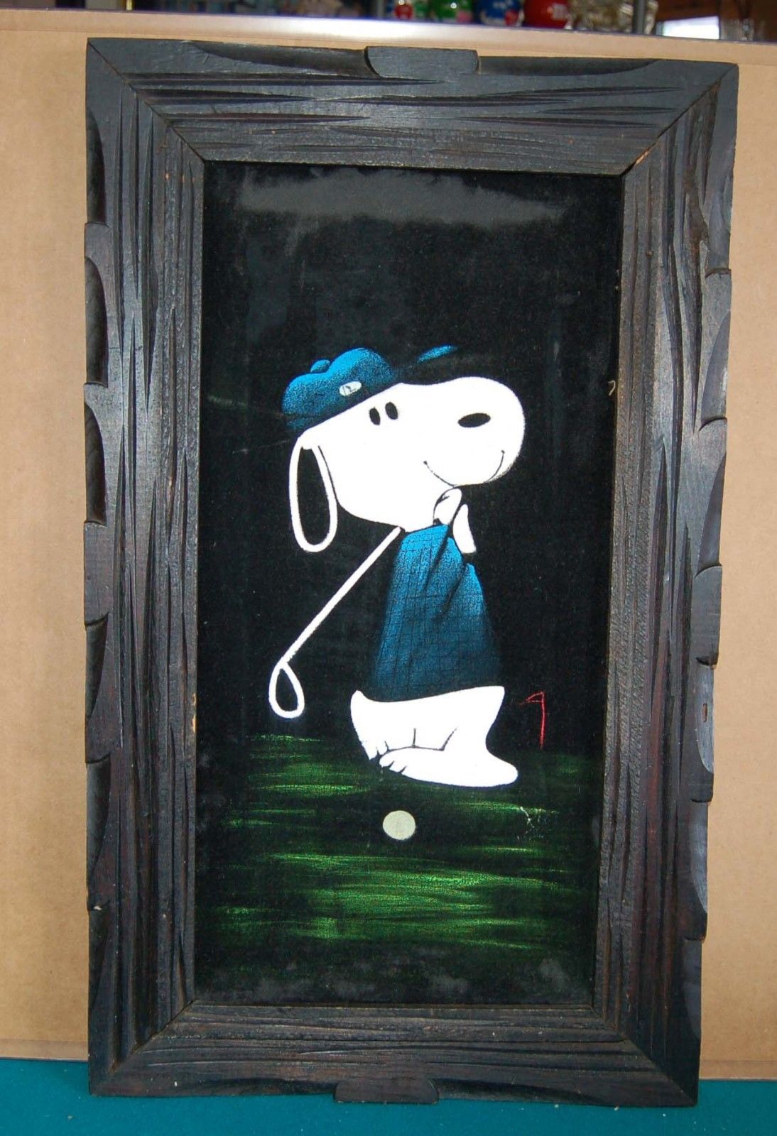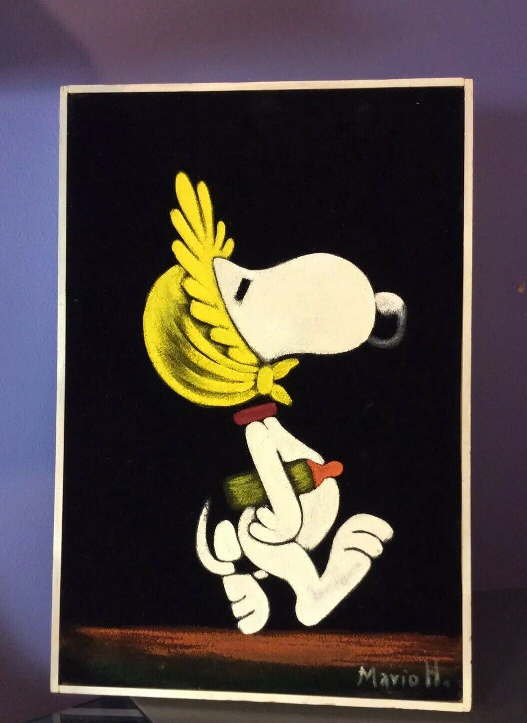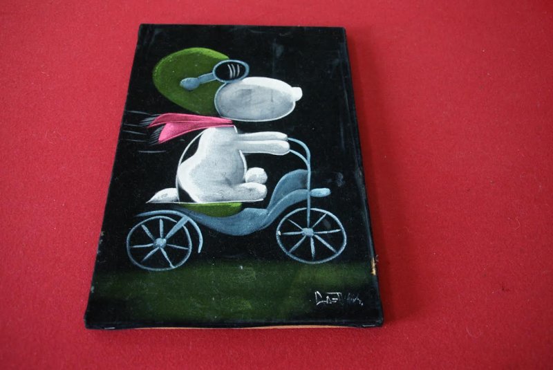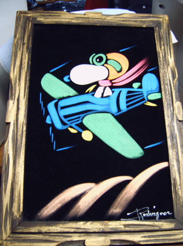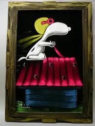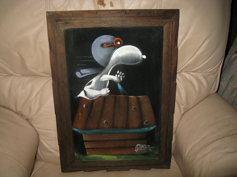 When roaming the aisle through antique stores or clicking through pages on eBay, the strange and unusual always make you pause for a moment. From time to time, you’ll contemplate how this item came into being. In Peanuts collecting, the oddity would be the Peanuts Black Velvet picture. Unlicensed and many made for tourists in Mexico, the Black Velvet artists were prolific back in the day. Their favorite Peanuts character is, of course, Snoopy. Between bull fighting, getting tipsy and riding motorcycles, the Black Velvet Snoopy’s strange pursuits are captured in bright, glowing paint.