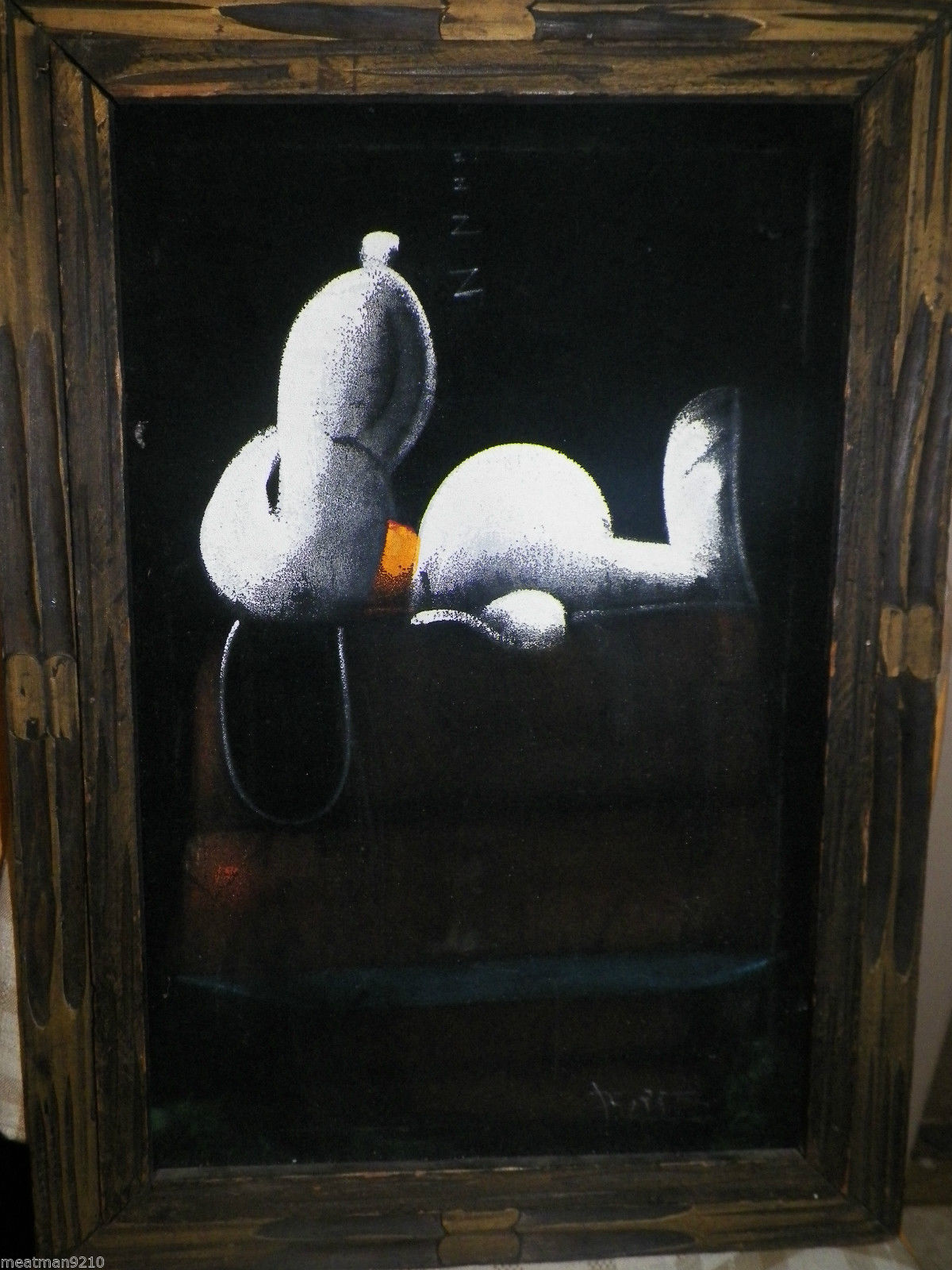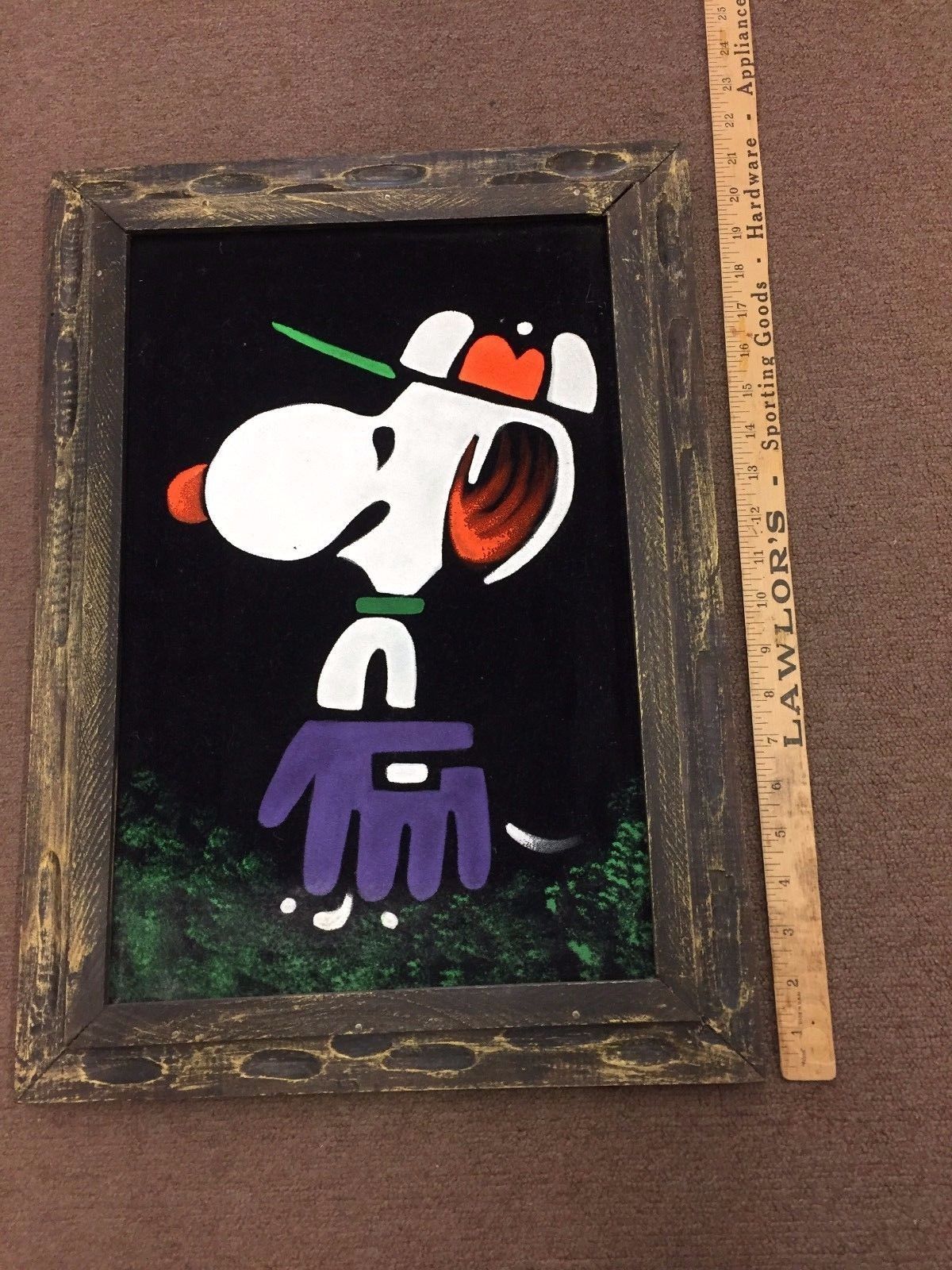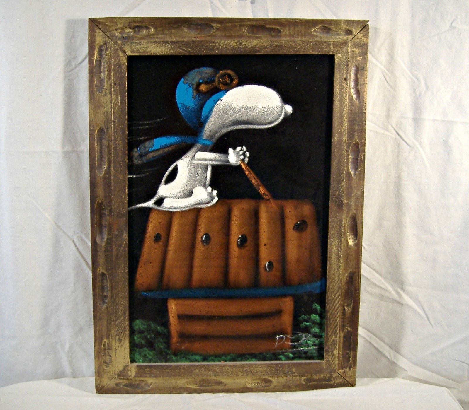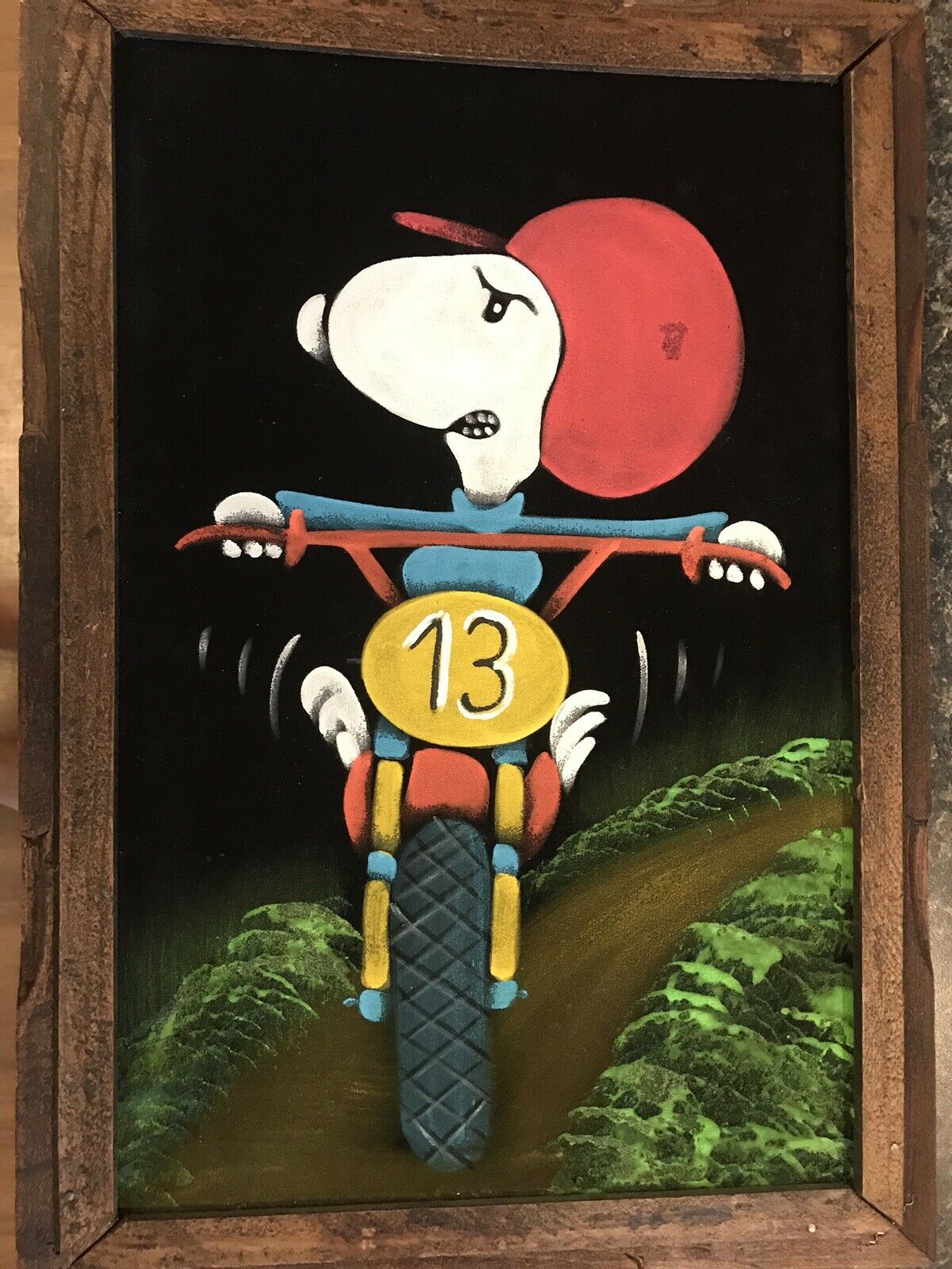 When roaming the aisle through antique stores or clicking through pages on eBay, the strange and unusual always make you pause for a moment. From time to time, you’ll contemplate how this item came into being. In Peanuts collecting, the oddity would be the Peanuts Black Velvet picture. Unlicensed and many made for tourists in Mexico, the Black Velvet artists were prolific back in the day. Their favorite Peanuts character is, of course, Snoopy. Between bull fighting, getting tipsy and riding motorcycles, the Black Velvet Snoopy’s strange pursuits are captured in bright, glowing paint.