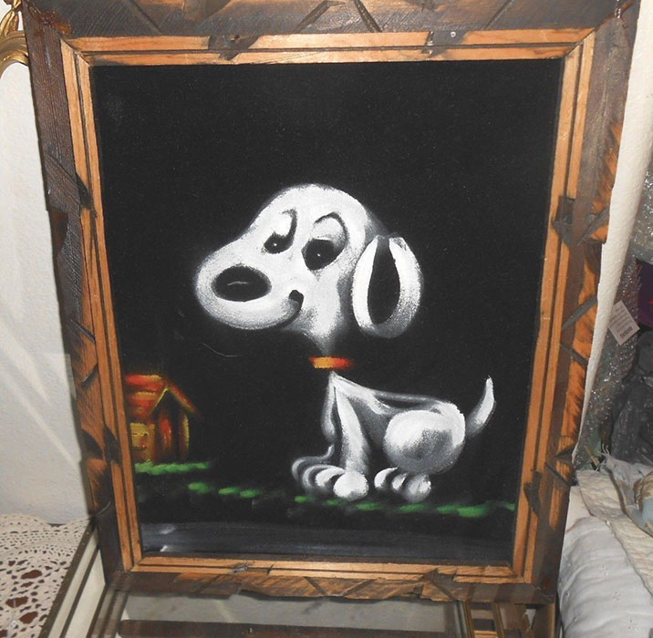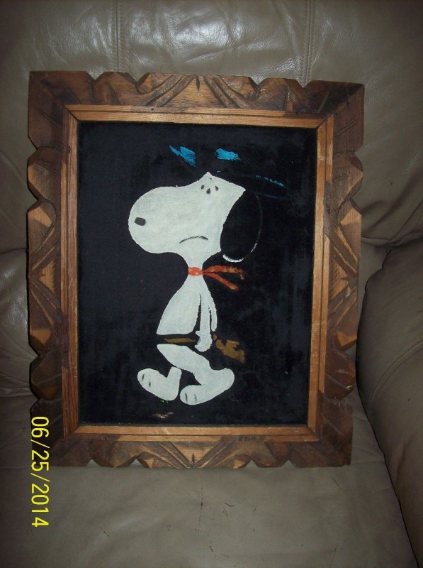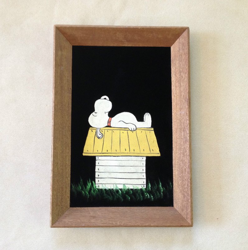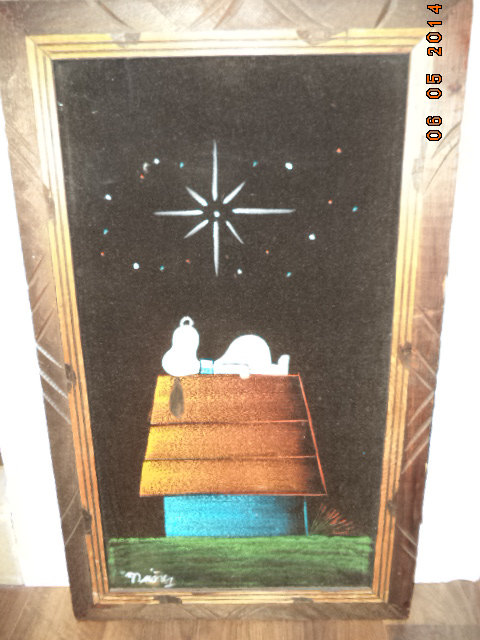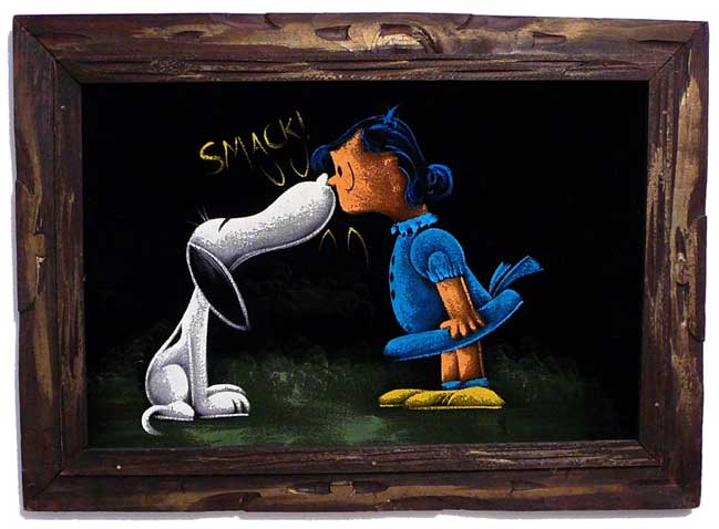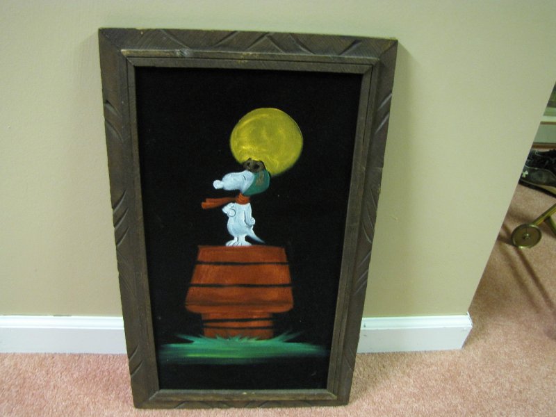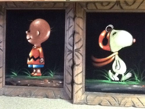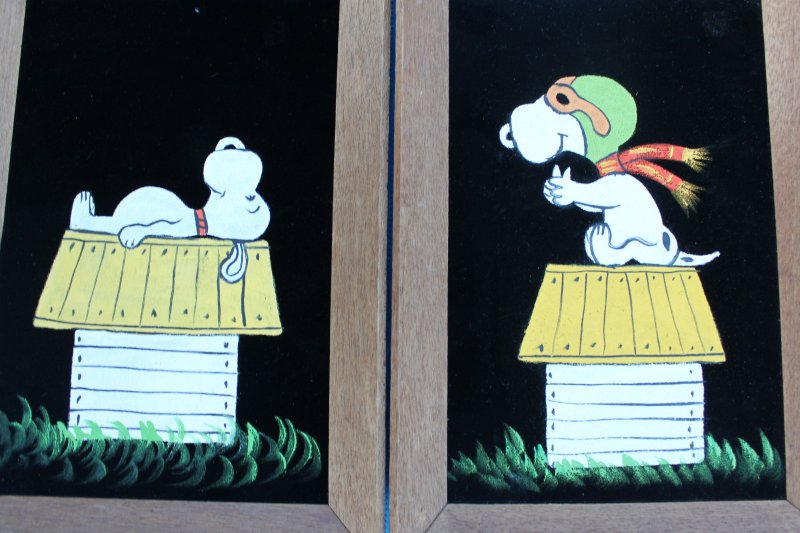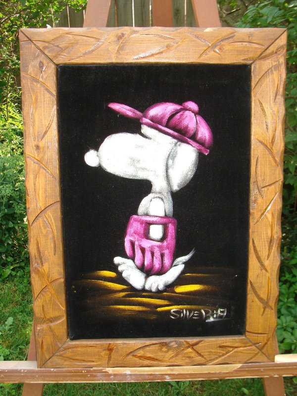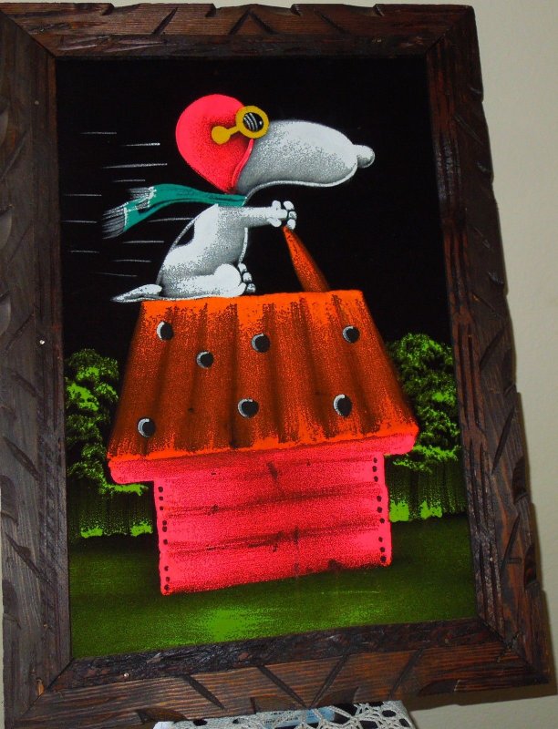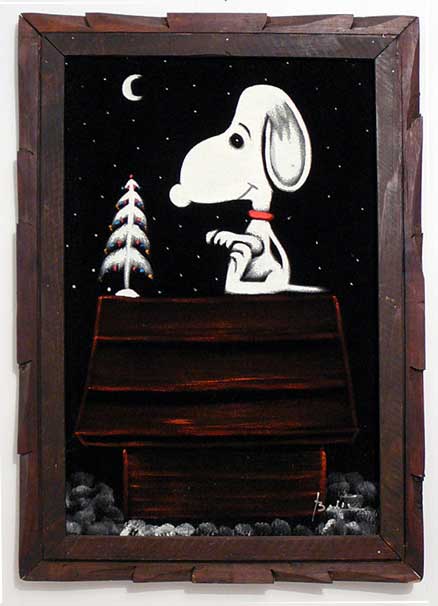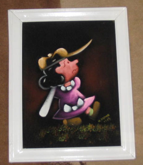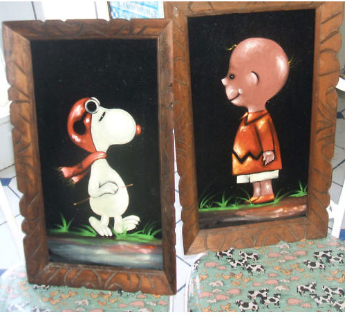 Some of these are crafted from licensed, vintage Peanuts Black Velvet painting kits. For example, the kit versions tend to look more like Peanuts characters and have flatter color.