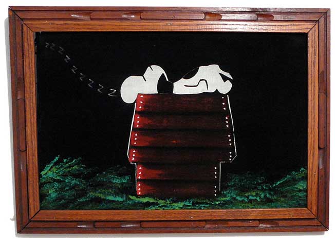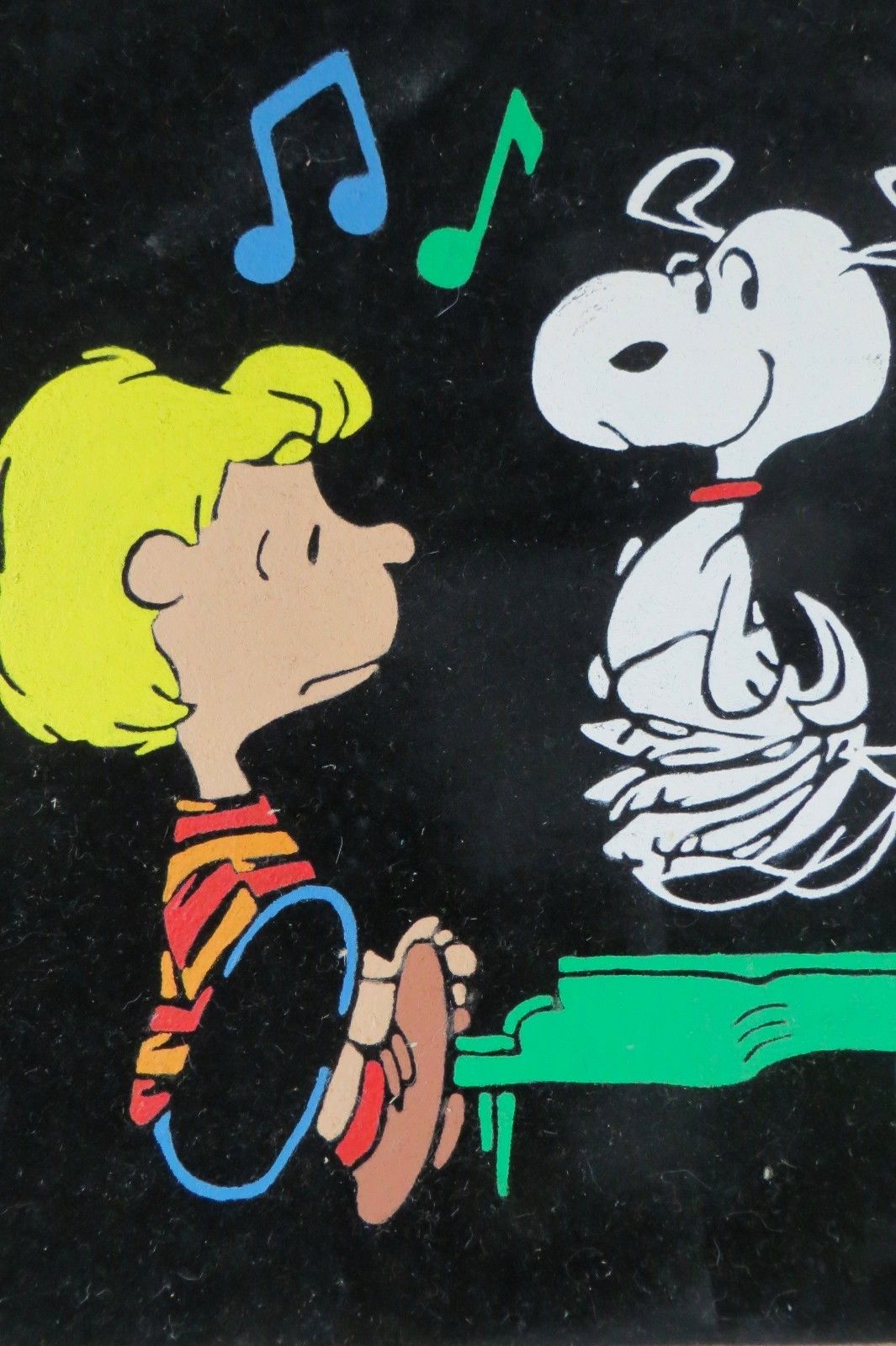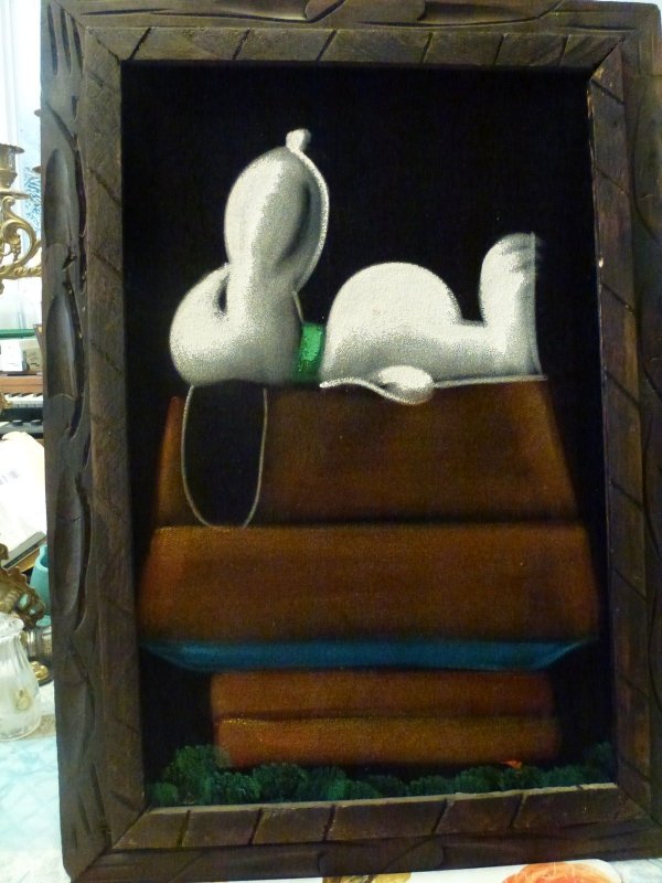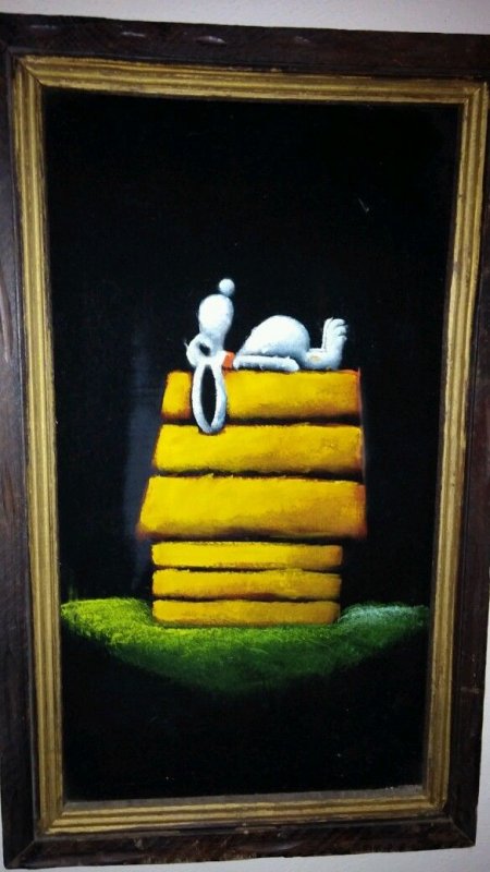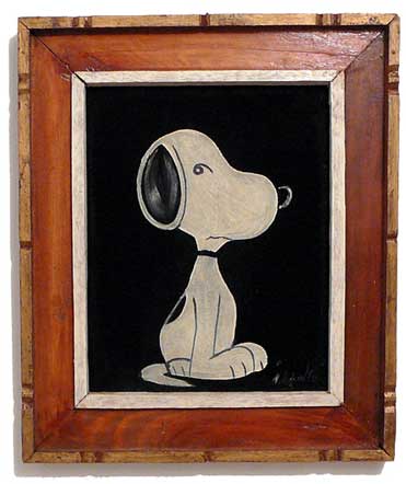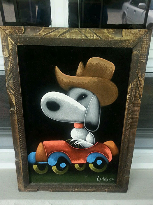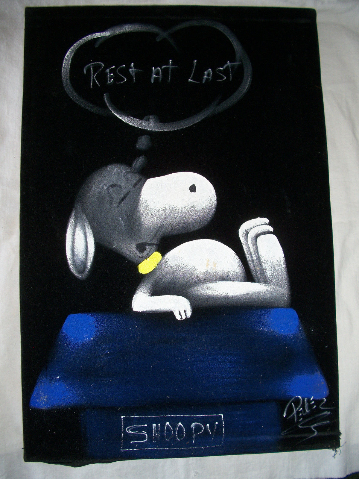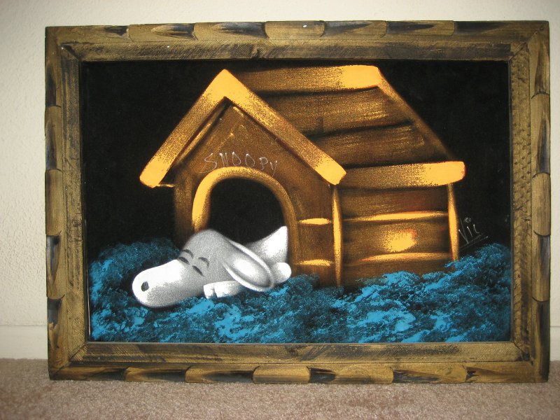 Some of these are crafted from licensed, vintage Peanuts Black Velvet painting kits. For example, the kit versions tend to look more like Peanuts characters and have flatter color.