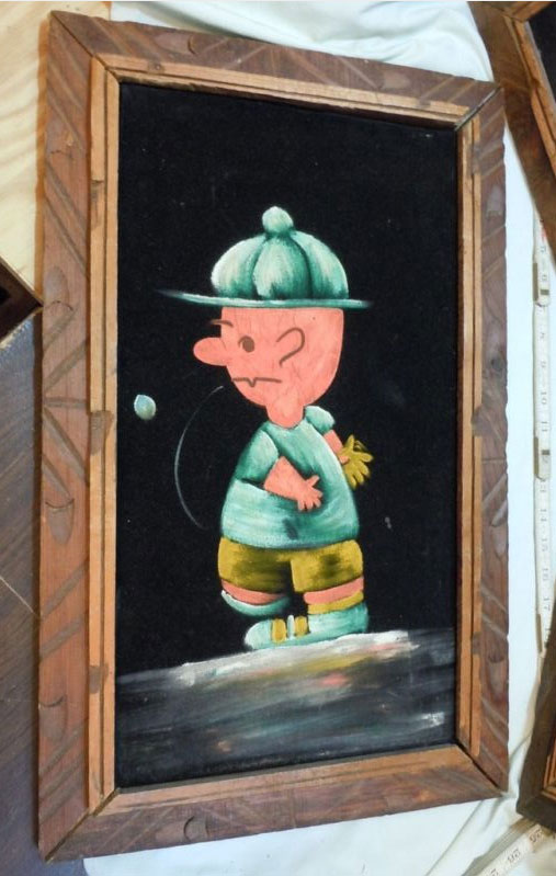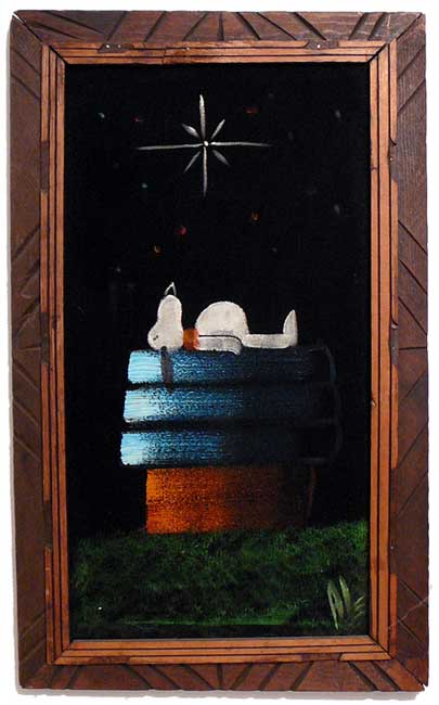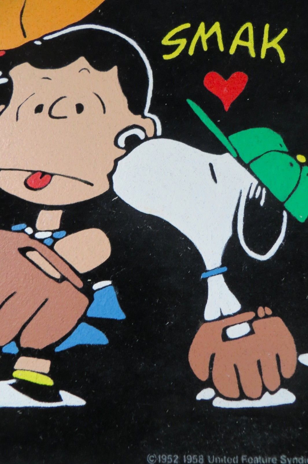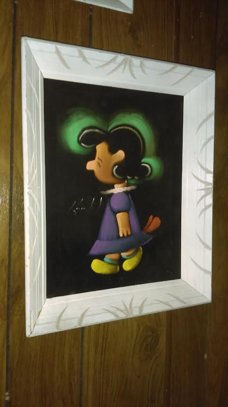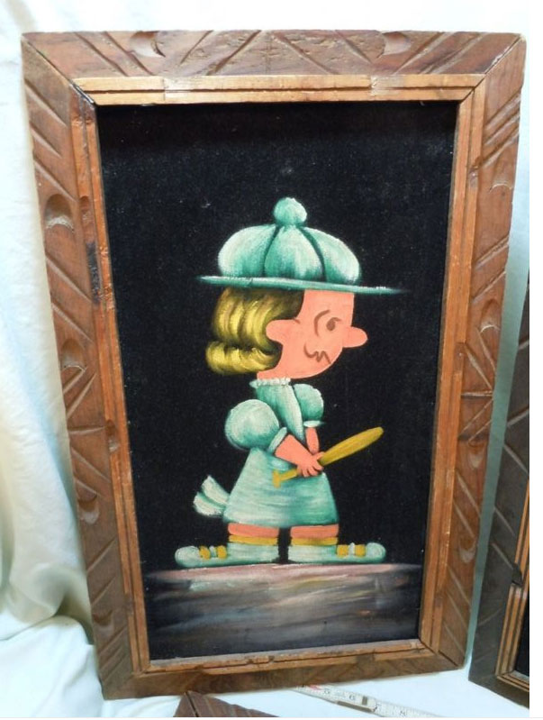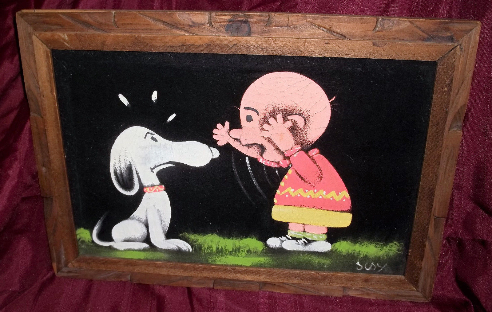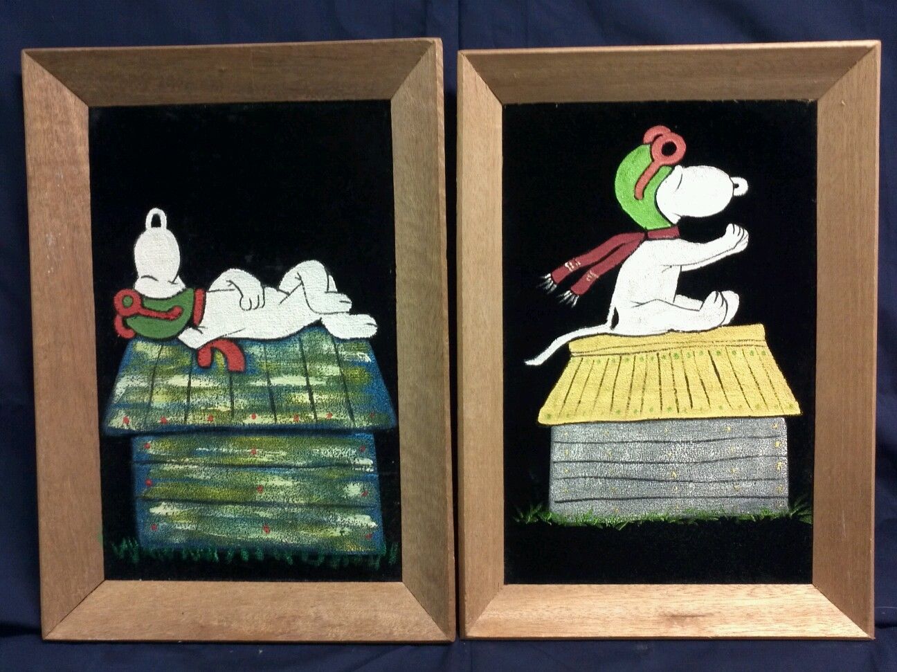 Some of these are crafted from licensed, vintage Peanuts Black Velvet painting kits. For example, the kit versions tend to look more like Peanuts characters and have flatter color.
