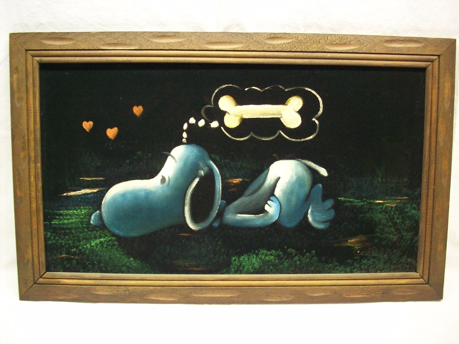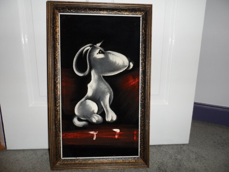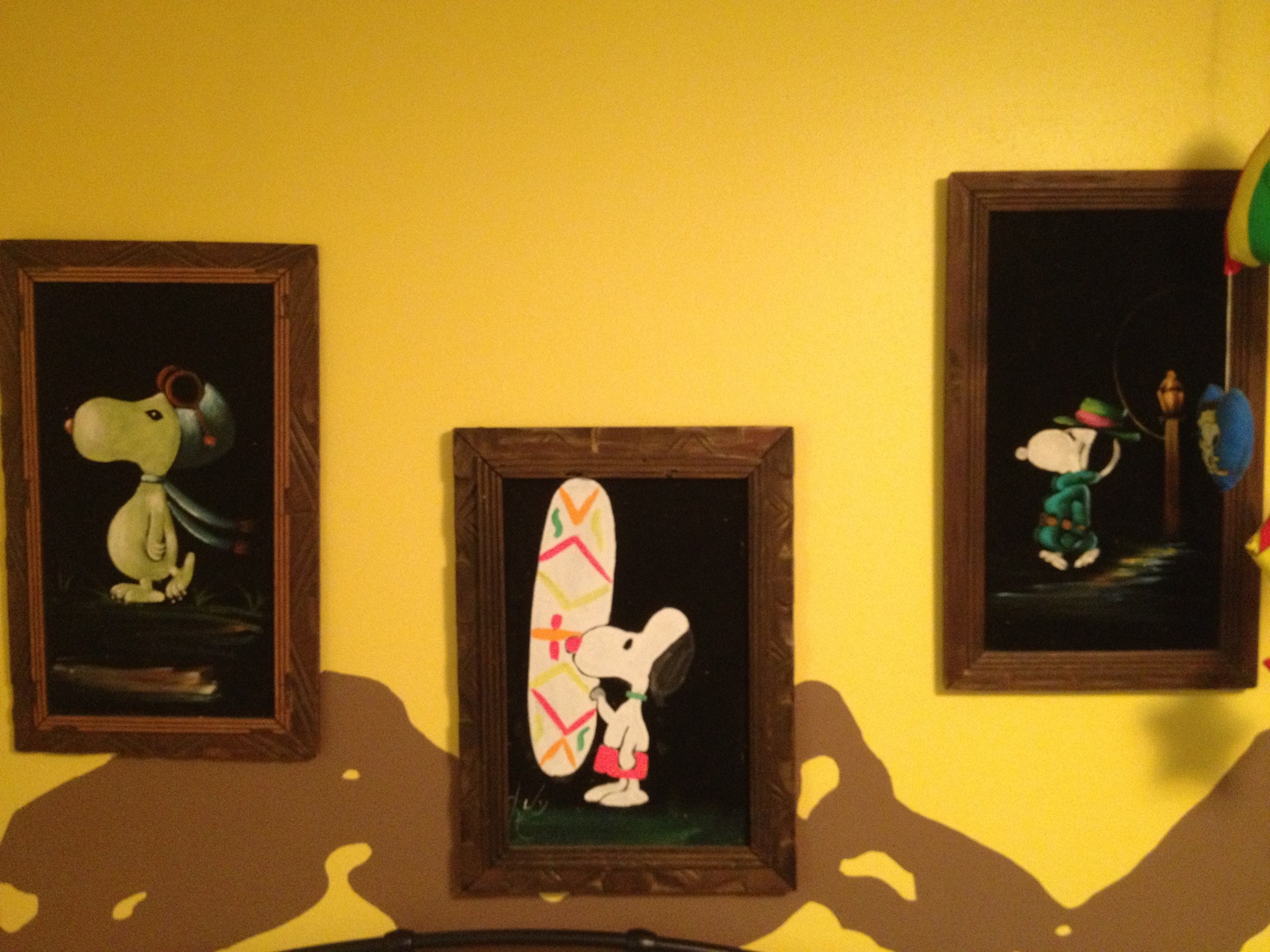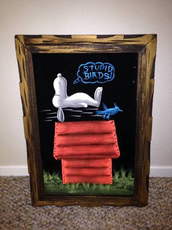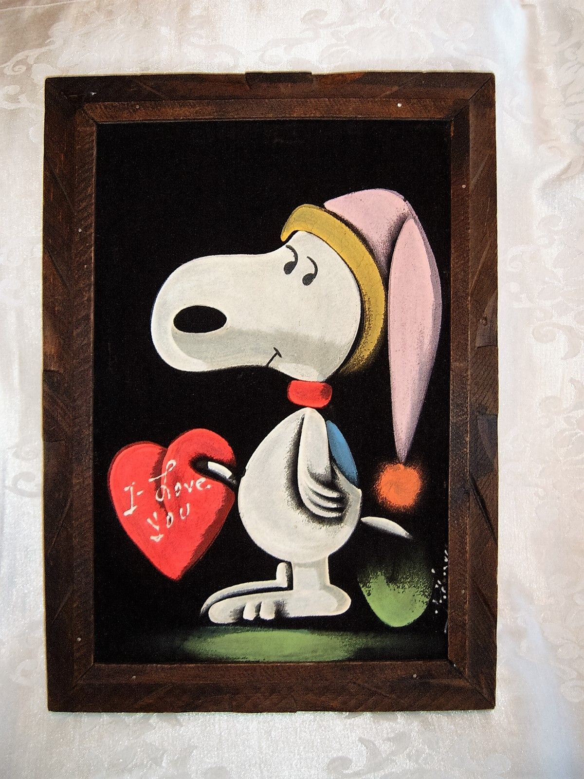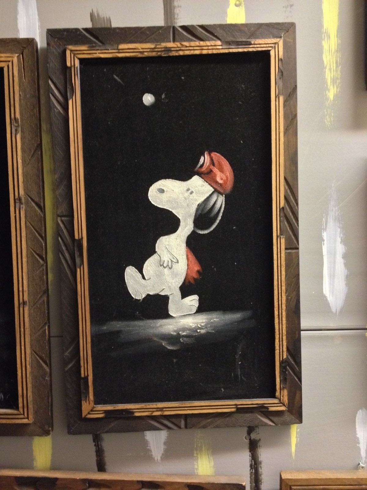 Some of these are crafted from licensed, vintage Peanuts Black Velvet painting kits. For example, the kit versions tend to look more like Peanuts characters and have flatter color.