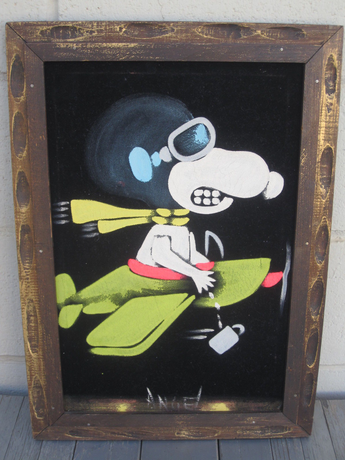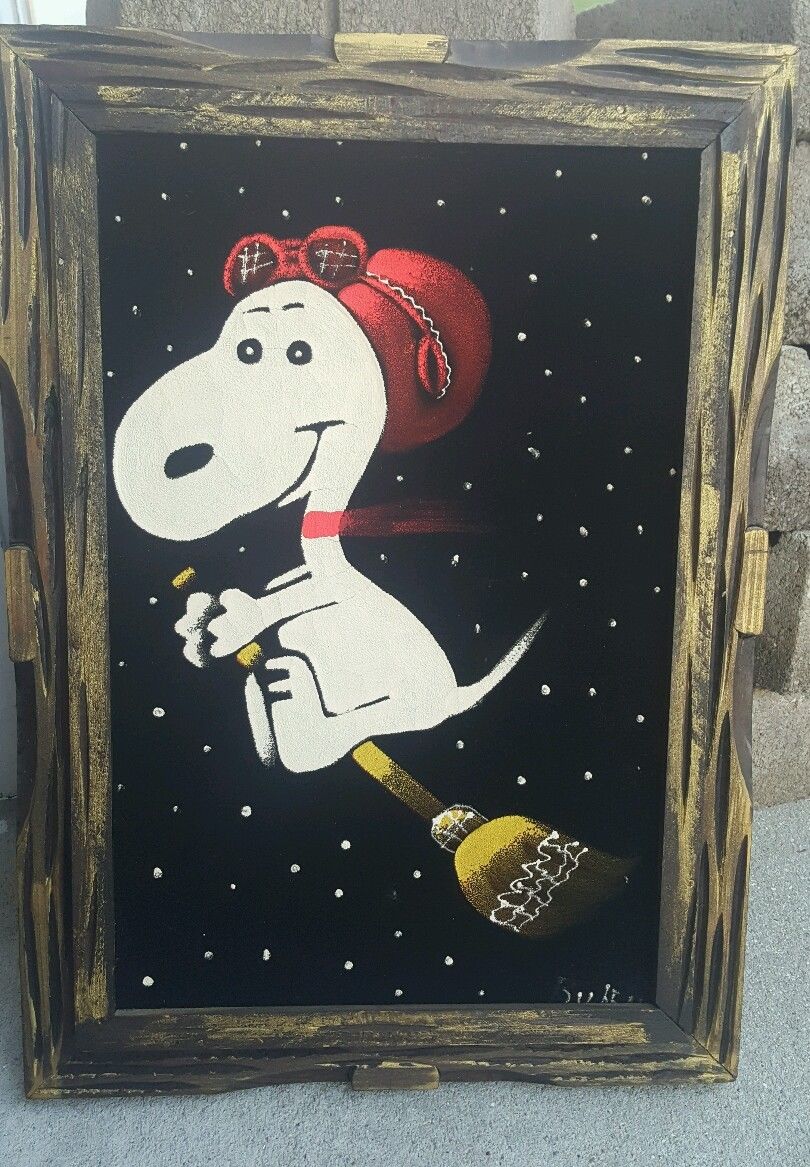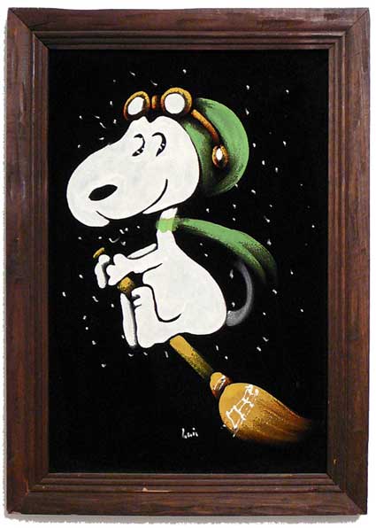 Snoopy Flying Ace on Broom Black Velvet Painting