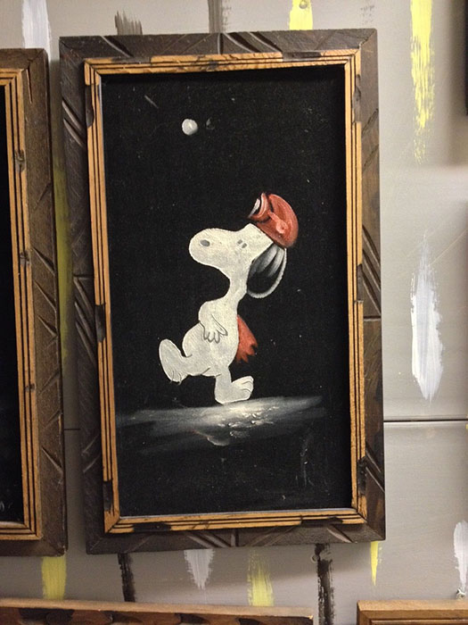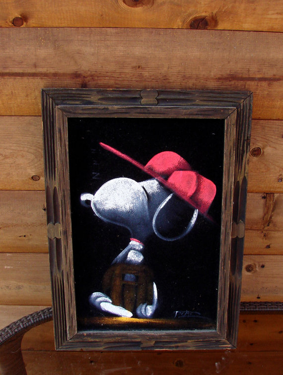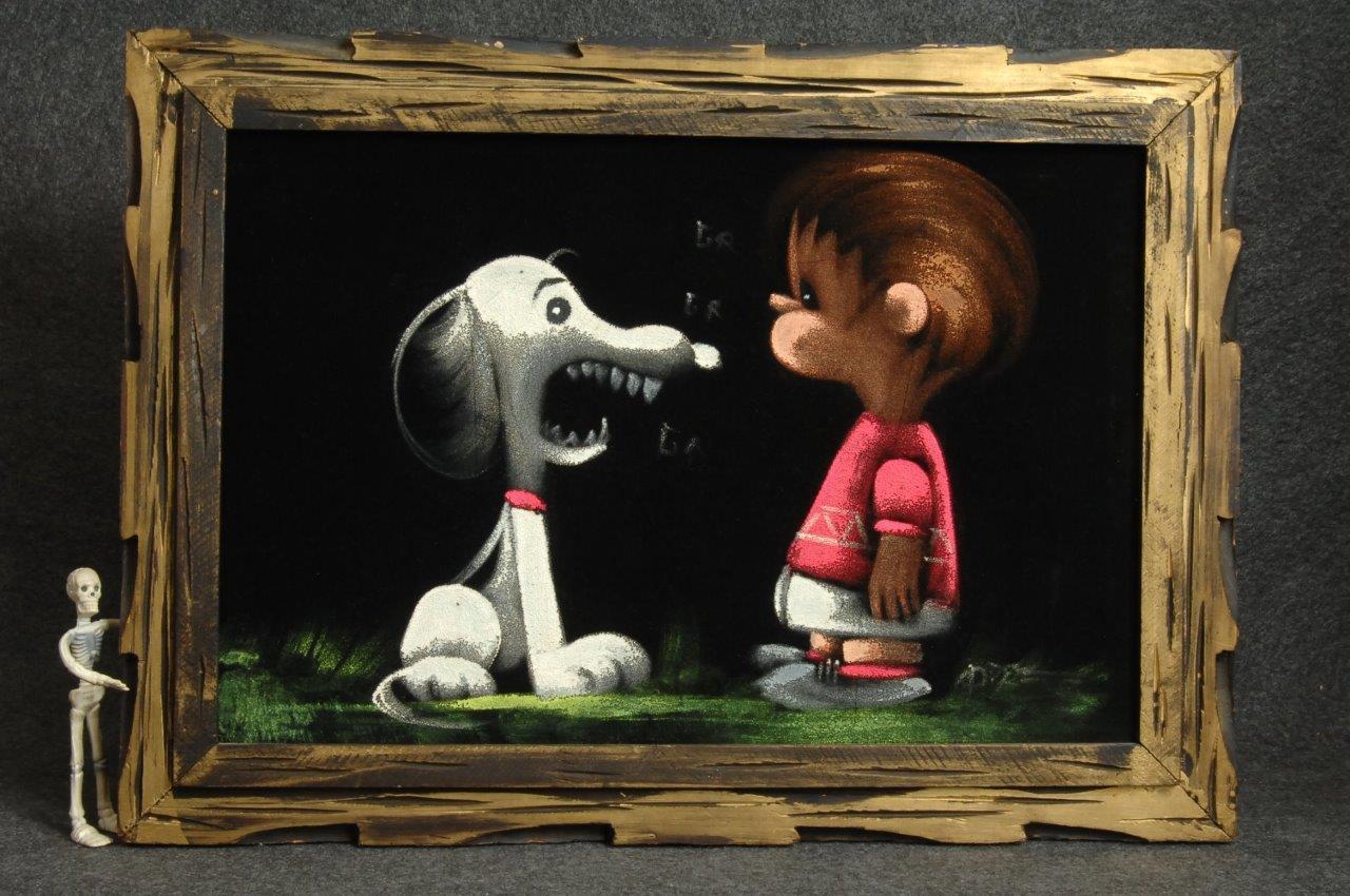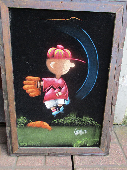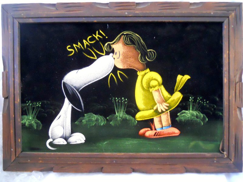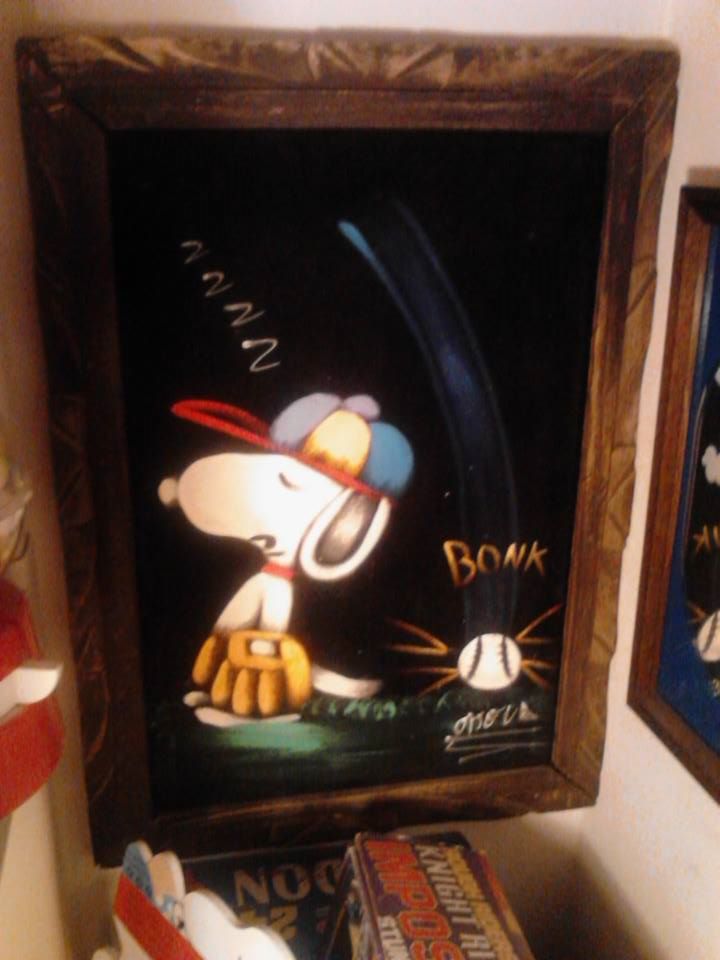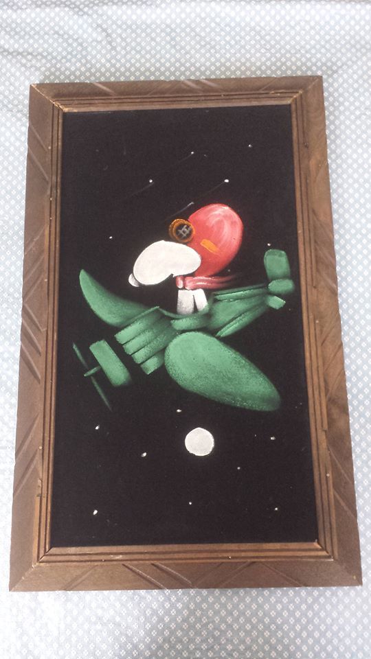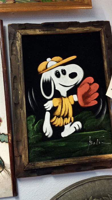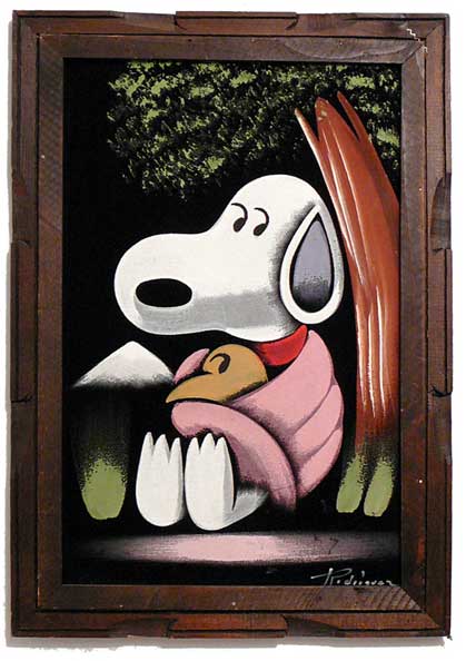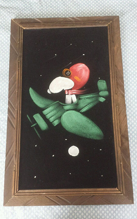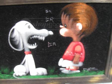 The artwork featured on this page is collected from the second-hand online shops full of unloved Peanuts Black Velvet Paintings. They are gathered here for your appreciation and amusement. While I don’t know their history or artists, the artistic license speaks for itself.